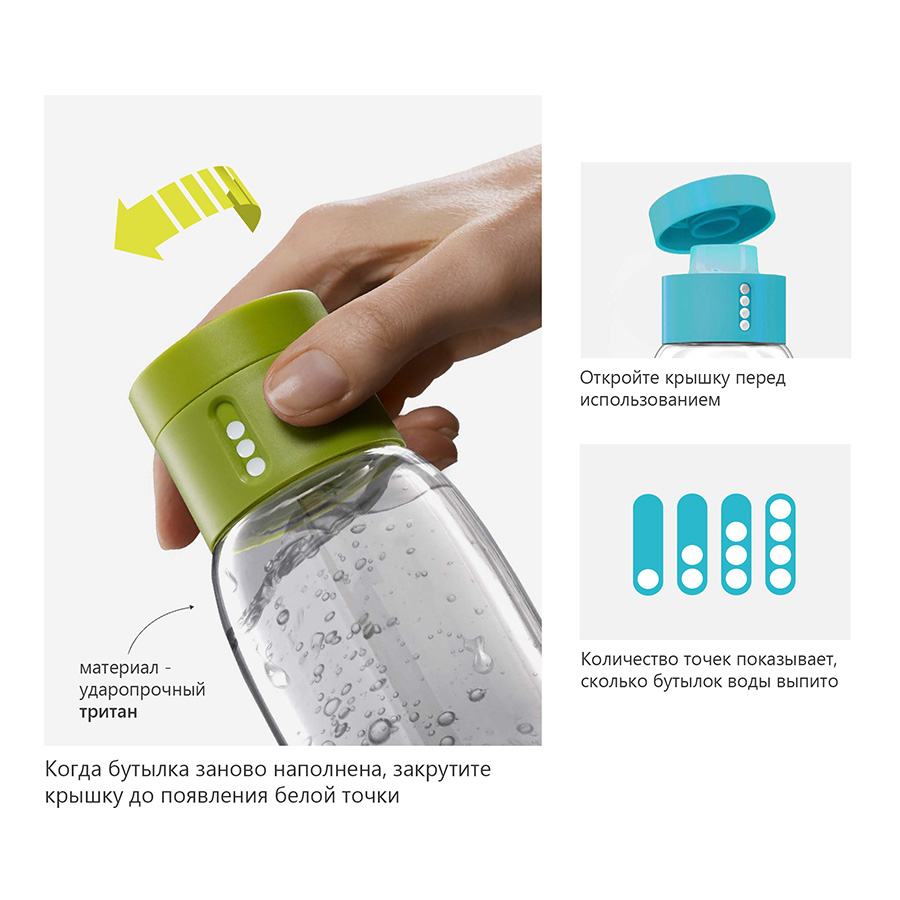 Инновационная крышка со счетчиком запомнит каждое наполнение бутылки в течение дня. Просто закрутите крышку до появления точки, а для питья используйте верхнюю крышку. Новая точка появится каждый раз, когда бутылка заново заполнена и крышка закручена. Из гладкого литого носика бутылки удобно пить, а широкое горлышко идеально для насыпания льда и мытья. Герметичная крышка надежно защитит содержимое от вытекания. Бутылка изготовлена из экологичного и удапрочного материала Tritan.