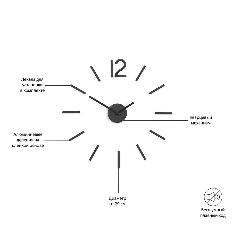 Индикаторы, цифра ",12", и механизм со стрелками выполнены из литого алюминия. Ход часов плавный и совершенно бесшумный. Работают они от одной стандартной AA батарейки (,не входит в комплект),.