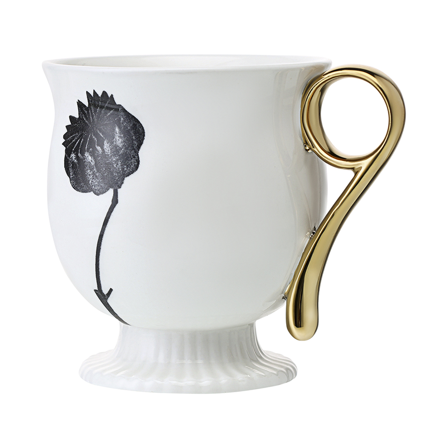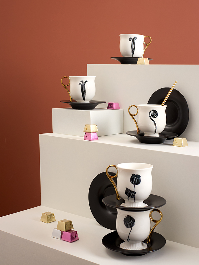 - Белоснежная чашка в сочетании с черным блюдцем создают эффектный контраст, акцентируя внимание на стильной сервировке.