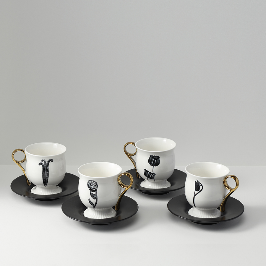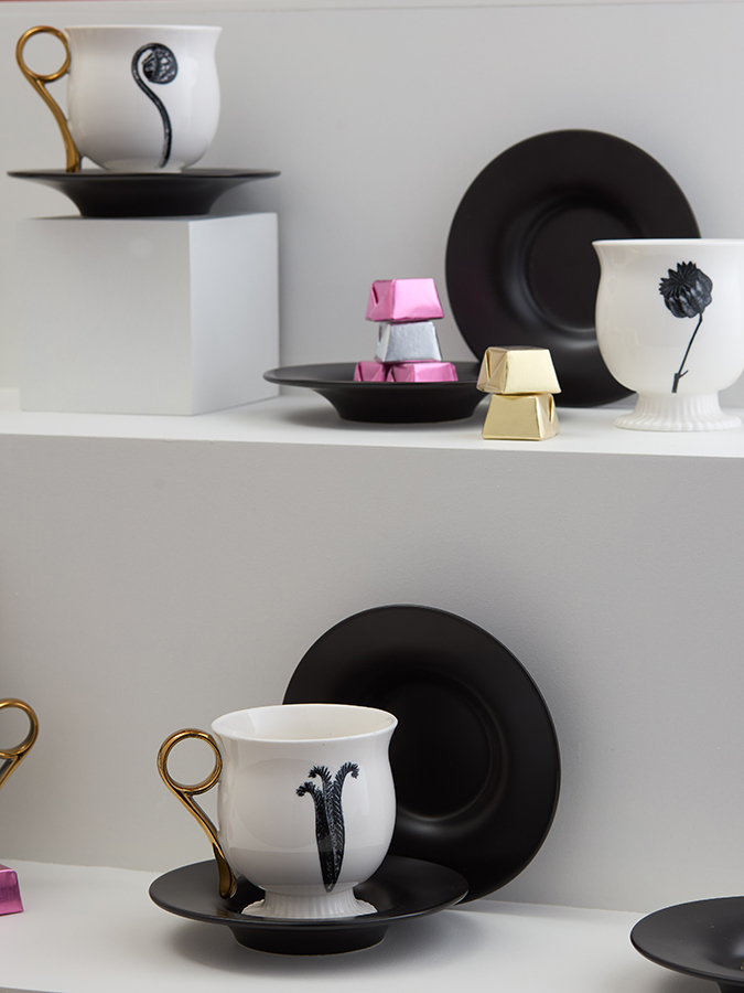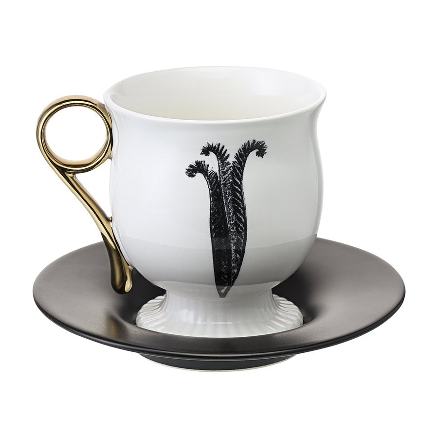 - Белоснежная чашка в сочетании с черным блюдцем создают эффектный контраст, акцентируя внимание на стильной сервировке.