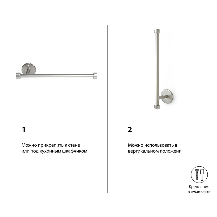Подходит для рулона любого размера. Держатель можно прикрепить на стену или ко дну шкафа с внешней стороны. Крепления входят в набор.
