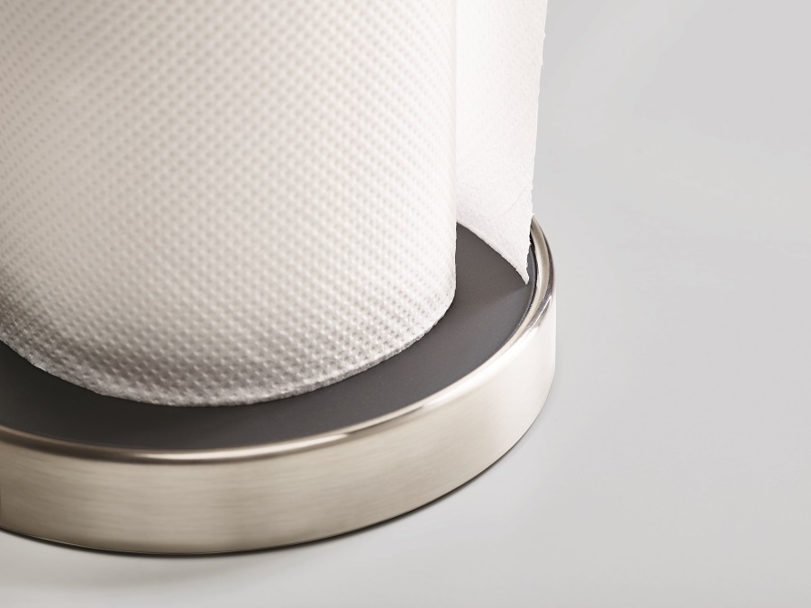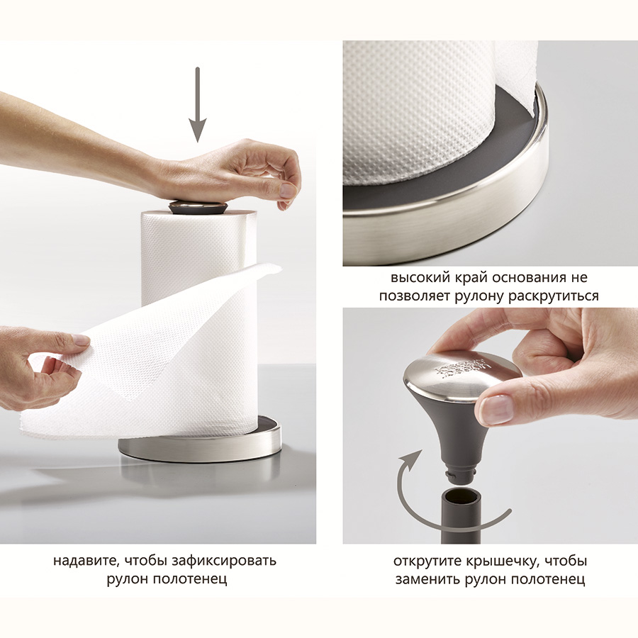 Наверху держатель оснащен пружинным механизмом, на который следует надавить, чтобы зафиксировать рулон для легкого разрыва. Широкое пластиковое основание защищено от опрокидывания и скольжения за счет резиновой накладки. Подходит только для рулонов бумажных полотенец стандартной высоты (,до 24 см),. Держатель рекомендуется протирать влажной тканью.