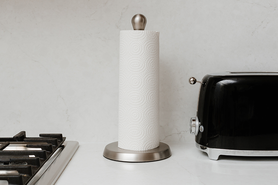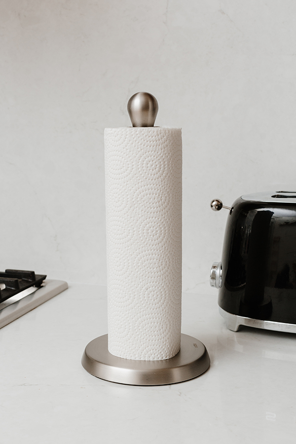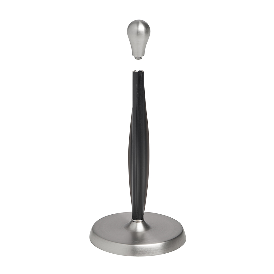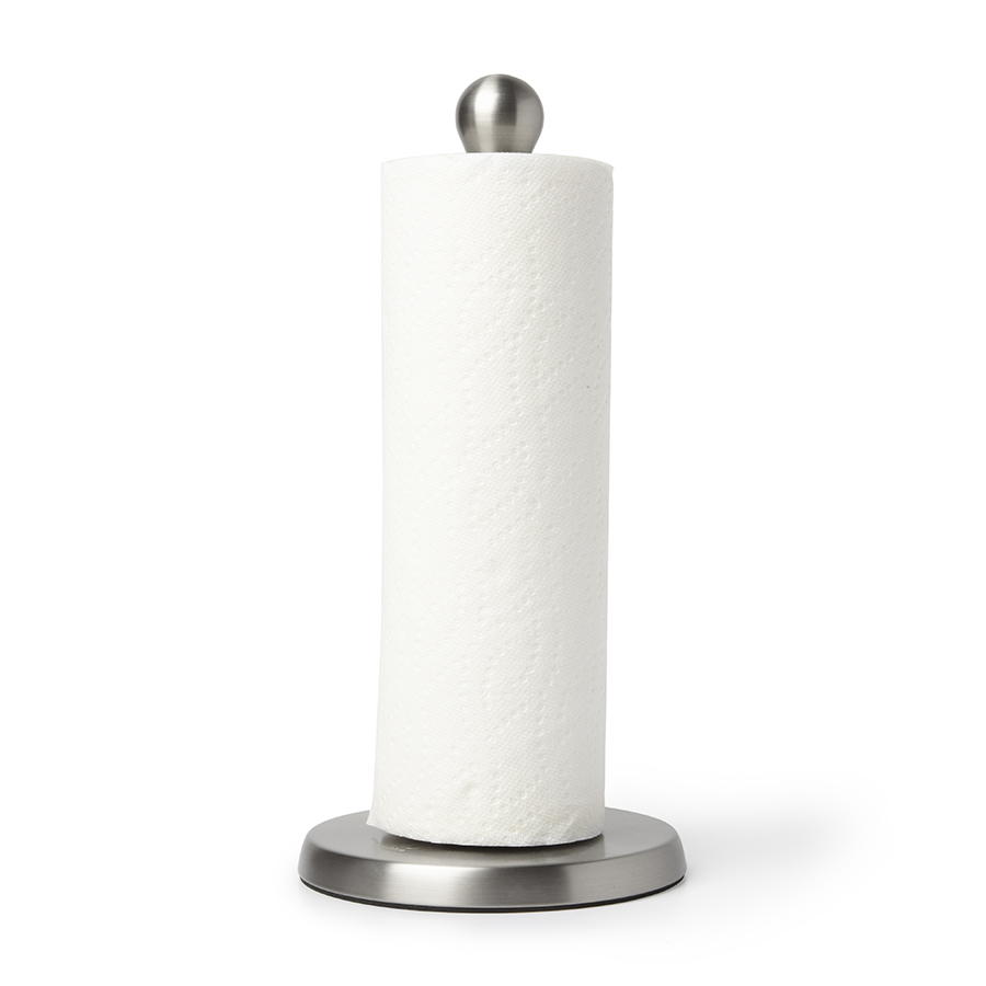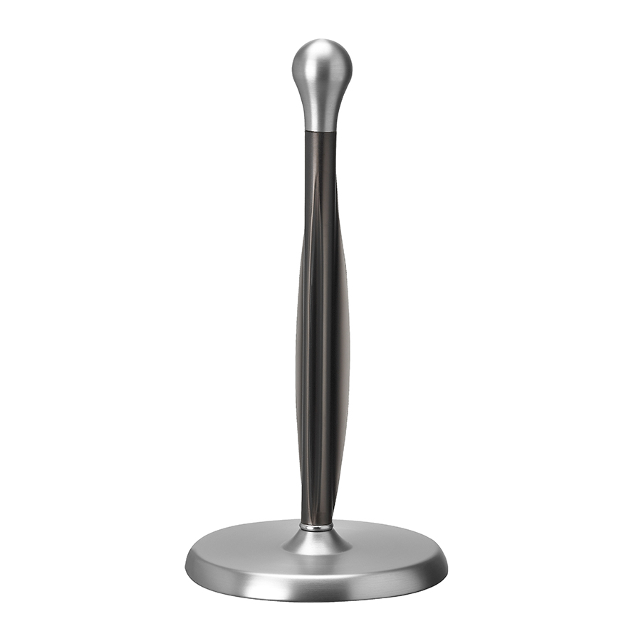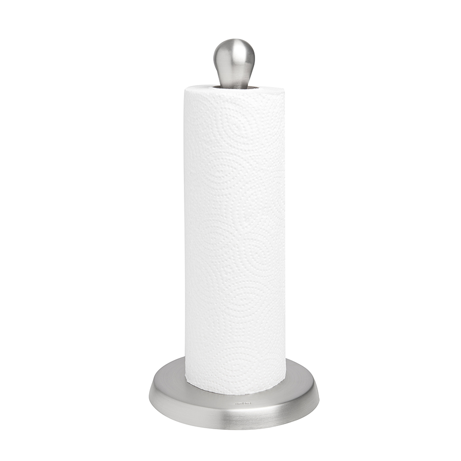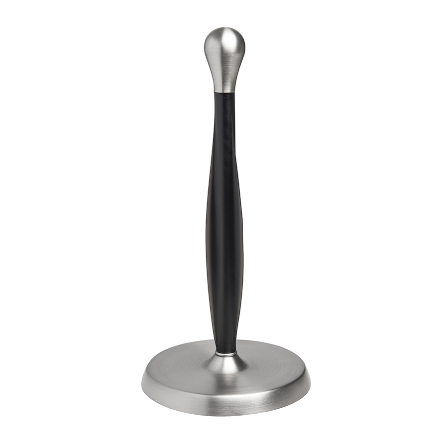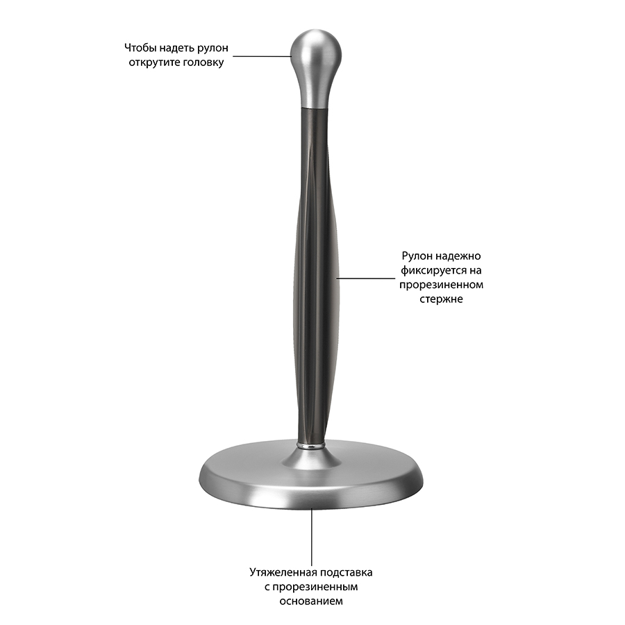 Изогнутый резиновый стержень отлично удерживает рулон бумажного полотенца, позволяя оторвать полотенце одной рукой. Металлическое основание обеспечивает устойчивость держателя во время использования, мягкое покрытие предотвращает скольжение и повреждение столешницы.