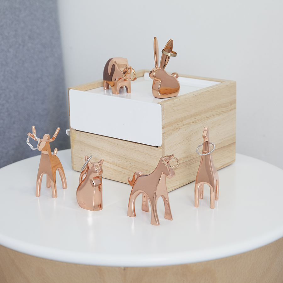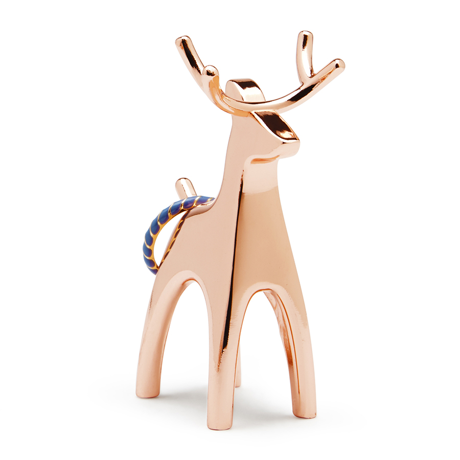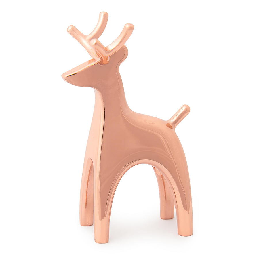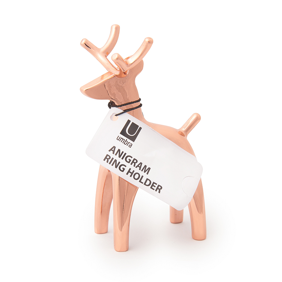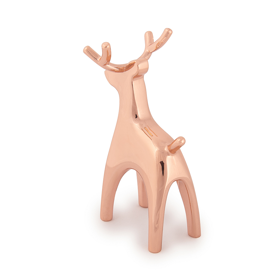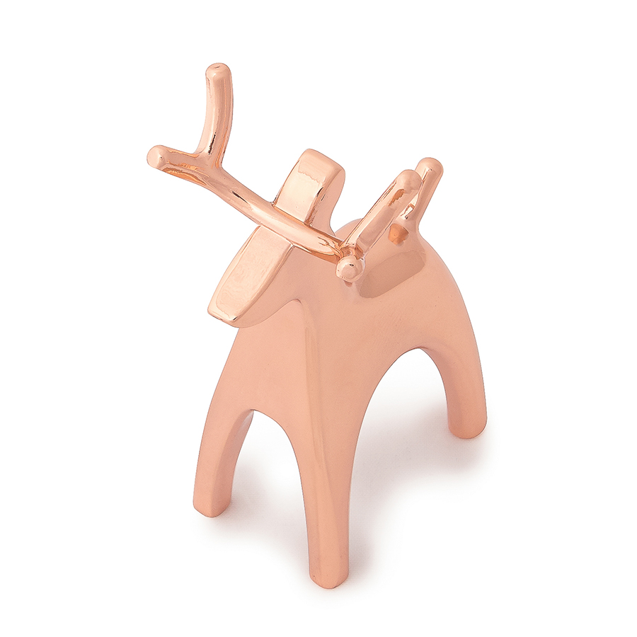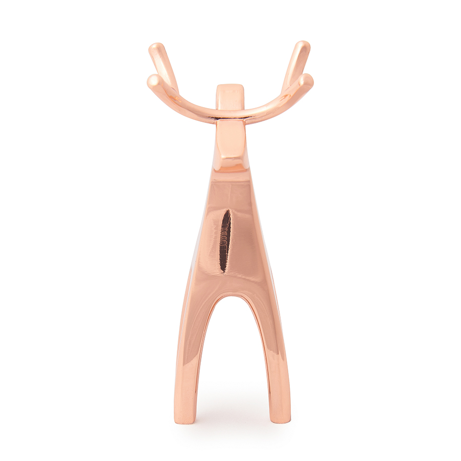 Рога являются импровизированными вешалками для колец и перстней, которые вмещают более 8 украшений. Аксессуар изготовлен из цинкового металла с блестящим хромированным покрытием. Основание подставки имеет войлочную подкладку для защиты поверхности от царапин.
