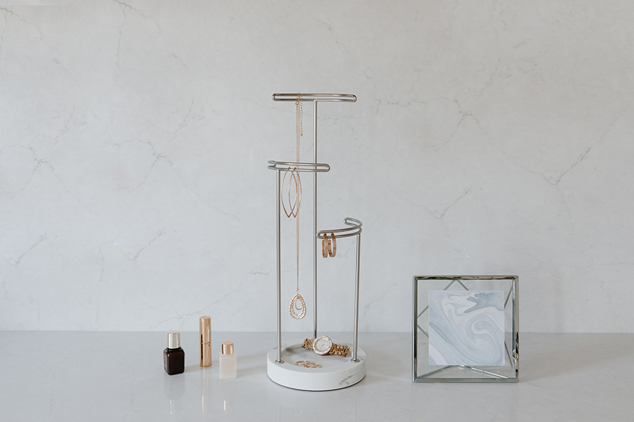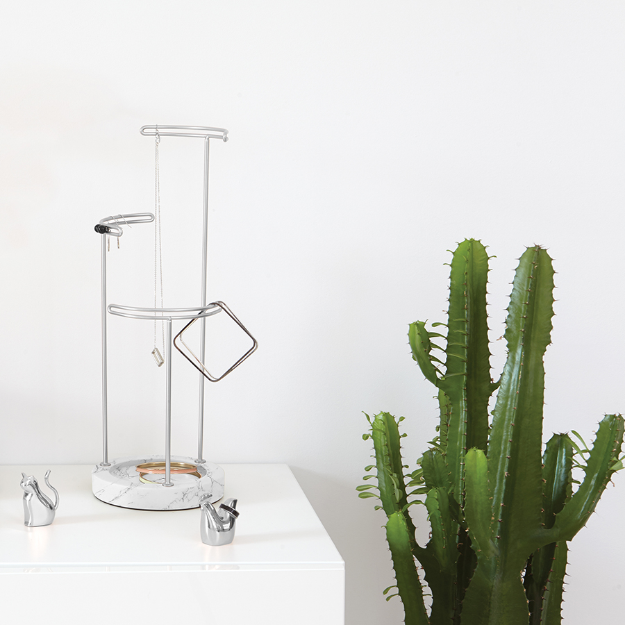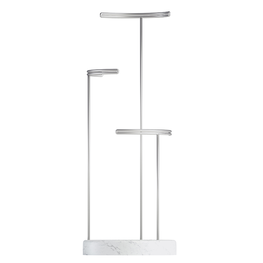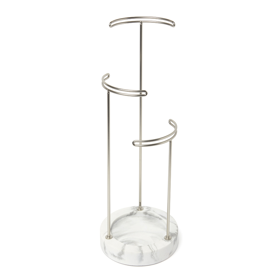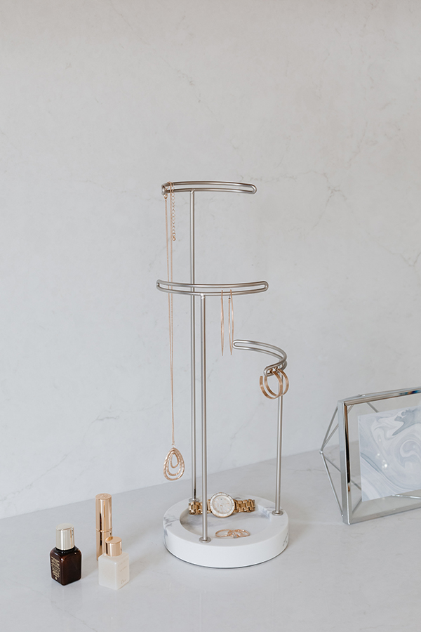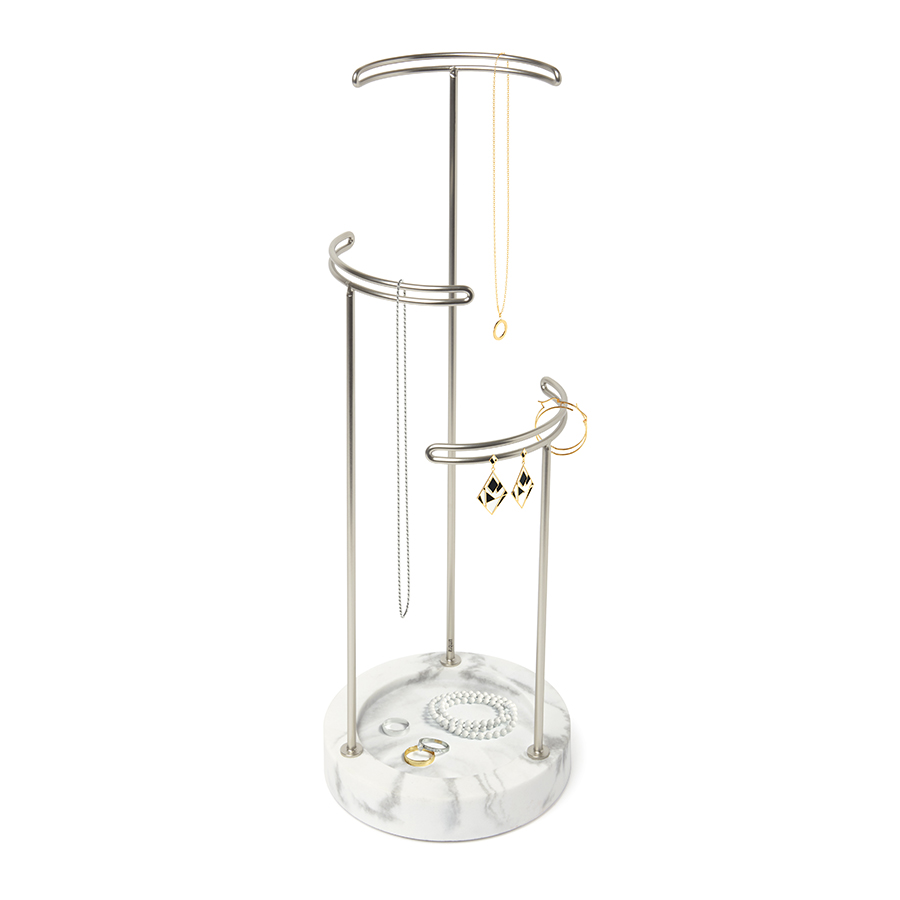 Утяжеленная стеклянная основа служит дополнительным отсеком для хранения, а прочные металлические стойки разной высоты подходят для украшений любой длины.