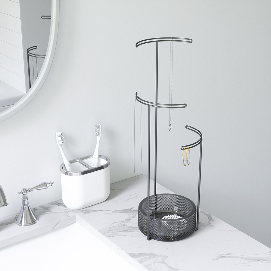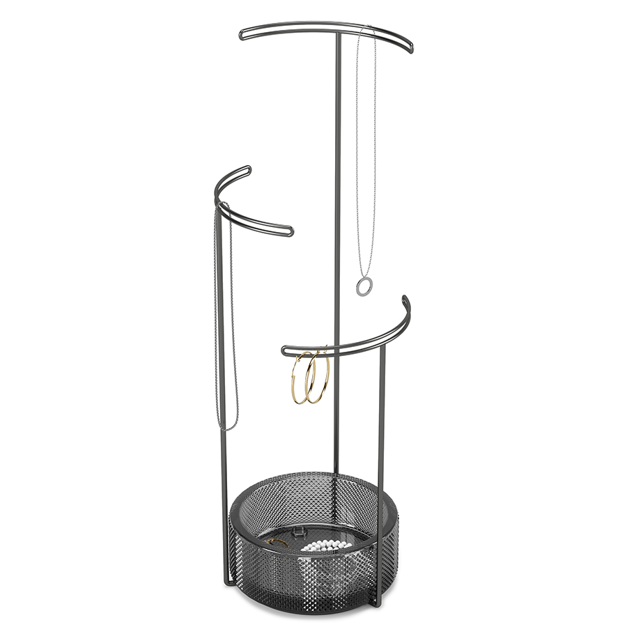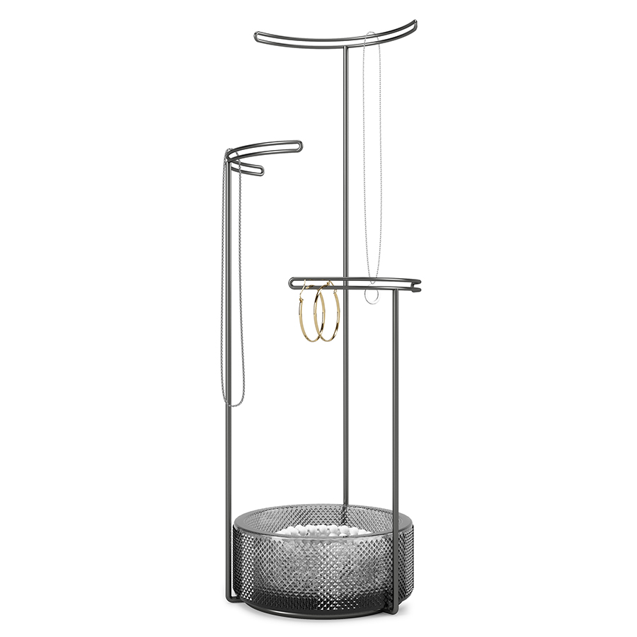 Утяжеленная стеклянная основа служит дополнительным отсеком для хранения, а прочные металлические стойки разной высоты подходят для украшений любой длины.