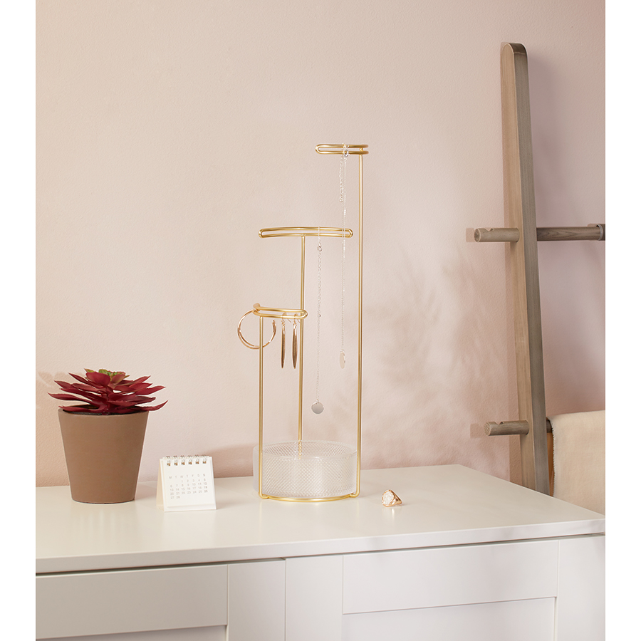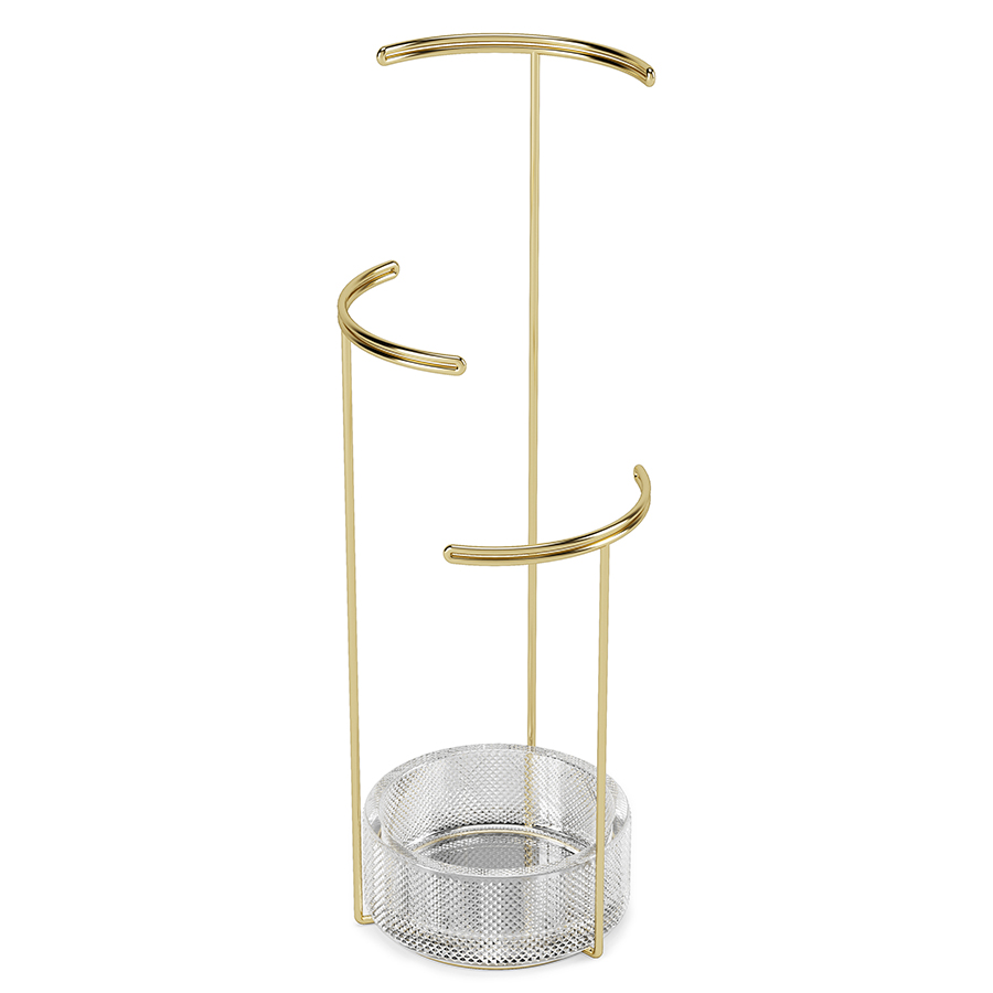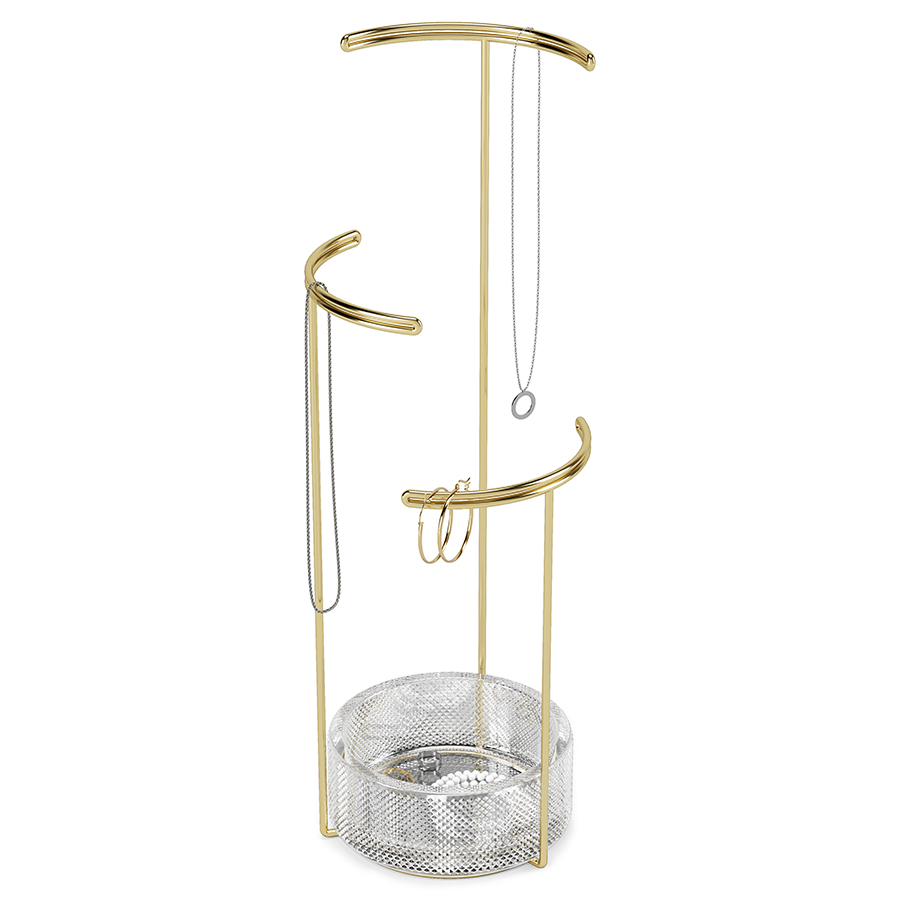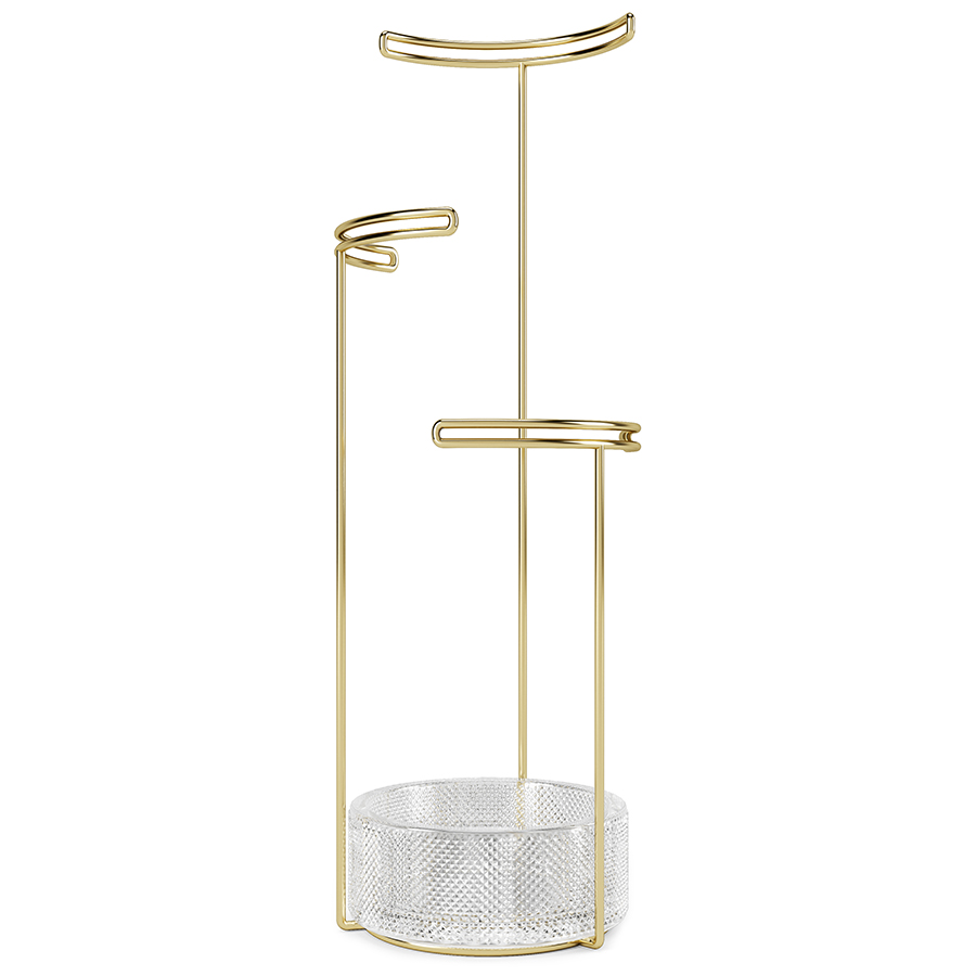 Утяжеленная стеклянная основа служит дополнительным отсеком для хранения, а прочные металлические стойки разной высоты подходят для украшений любой длины.