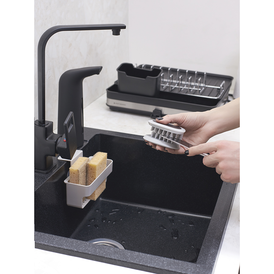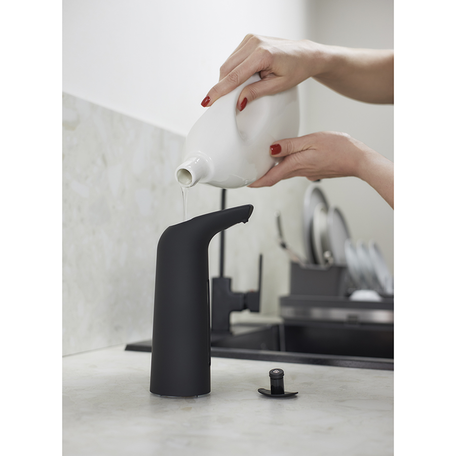 Диспенсер работает от 4-х батареек типа ААА, которые вставляются в нижней части устройства. Мигающий индикатор сообщает о низком уровне заряда и о необходимости замены источника питания. Жидкость добавляется через верхнюю часть корпуса. Одна порция мыла приблизительно равна 1 мл. Для увеличения дозировки необходимо подержать руки под датчиком около 2 секунд. Оптимальное расстояние от рук до сенсора – 5 см.