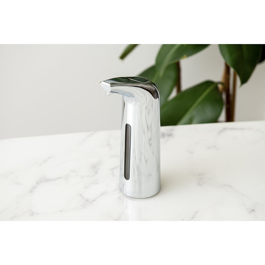 Диспенсер работает от 4-х батареек типа ААА, которые вставляются в нижней части устройства. Мигающий индикатор сообщает о низком уровне заряда и о необходимости замены источника питания. Жидкость добавляется через верхнюю часть корпуса. Одна порция мыла приблизительно равна 1 мл. Для увеличения дозировки необходимо подержать руки под датчиком около 2 секунд. Оптимальное расстояние от рук до сенсора – 5 см.