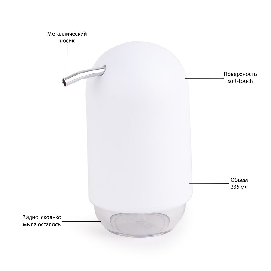 Сквозь прозрачную нижнюю часть вы сразу увидите, если мыло кончается, и сможете пополнить резервуар. Объем: 235 мл.
