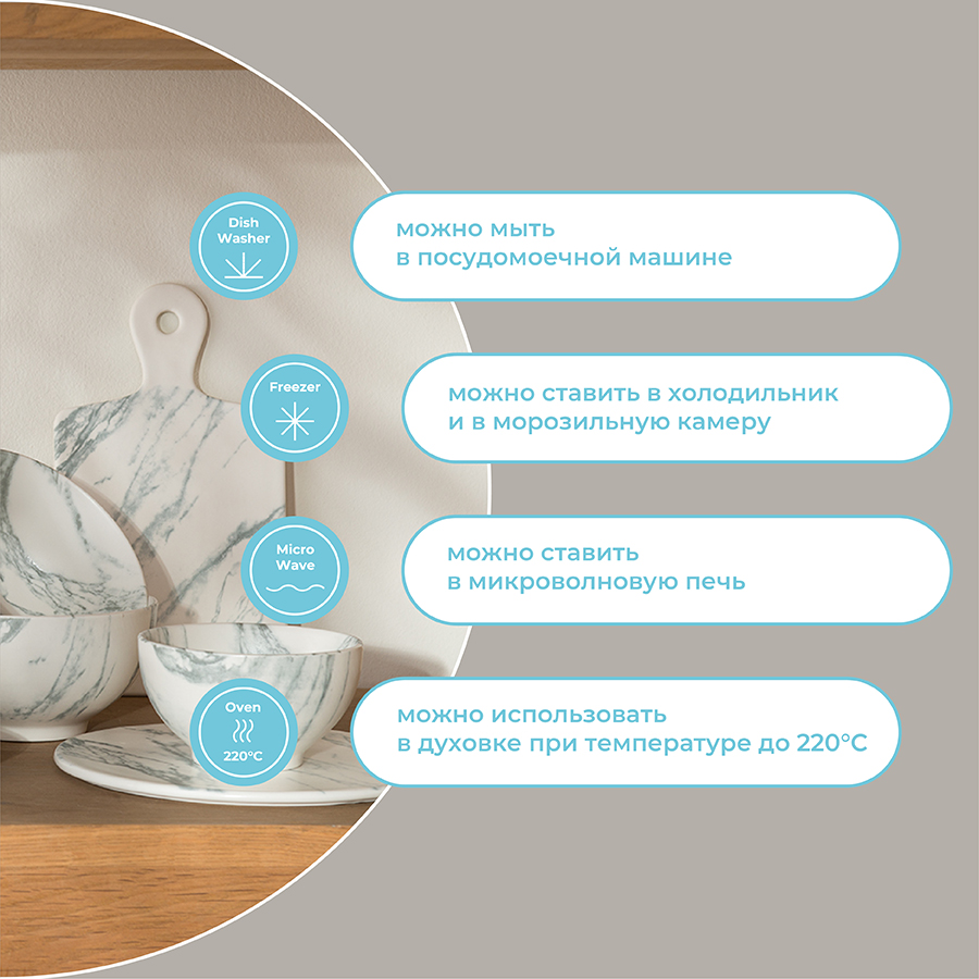 Можно мыть в посудомоечной машине, ставить в микроволновую печь, морозильную камеру, а также использовать в духовке при температуре не выше 180 °C.