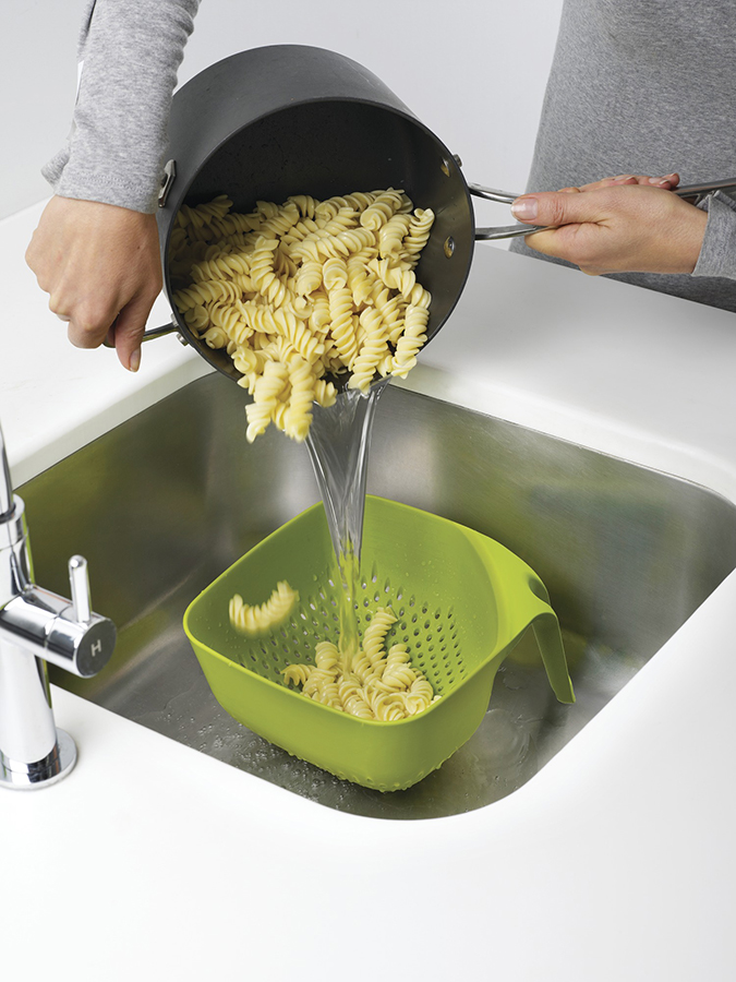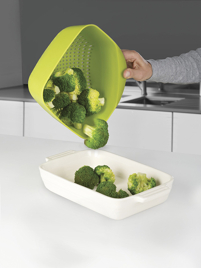 Дуршлаги Square оснащены обновлёнными эргономичными рукоятками, которые вставляются одна в другую для компактного хранения. Их вертикальное расположение обеспечивает устойчивость на ровных поверхностях (,стол, раковина, полка),. Дуршлаг Square удобно держать одной рукой. Квадратная форма и вертикальные отверстия позволяют быстро сливать жидкость. Дуршлаг выполнен из пластика и идеально подходит для мытья ягод, фруктов, овощей и зелени.