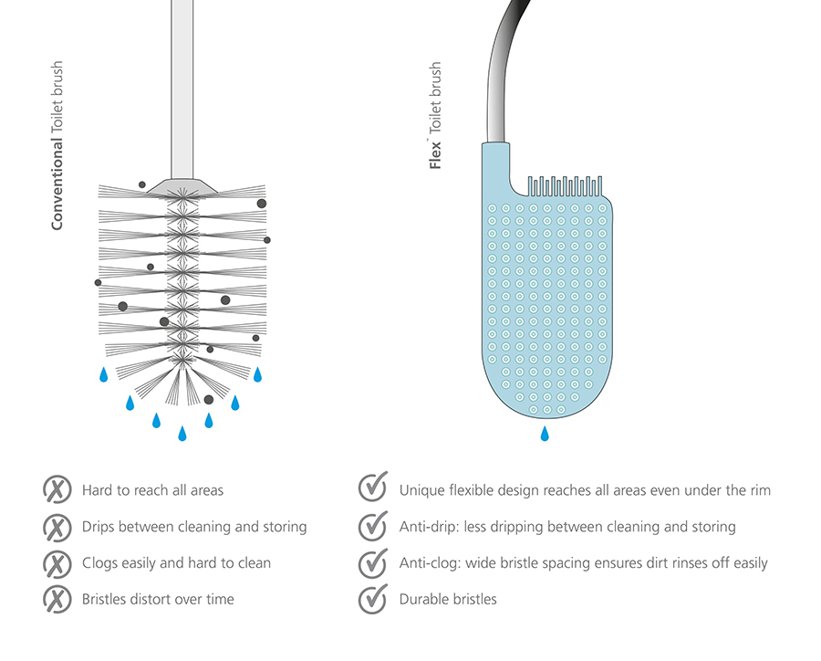 Гибкая полимерная щетка эффективно очищает все труднодоступные места и не впитывает воду. Высокотехнологичный материал ёршика не притягивает грязь и легко моется. Двухуровневая щетина с большим расстоянием между щетинками не дает грязи скапливаться. После уборки ёршик не надо стряхивать, пытаясь очистить и высушить: благодаря уникальному дизайну Flex™, вода быстро стекает со щетки и не оставляет лишних капель. Удобная и компактная подставка дополняет этот эргономичный аксессуар и не занимает много места.