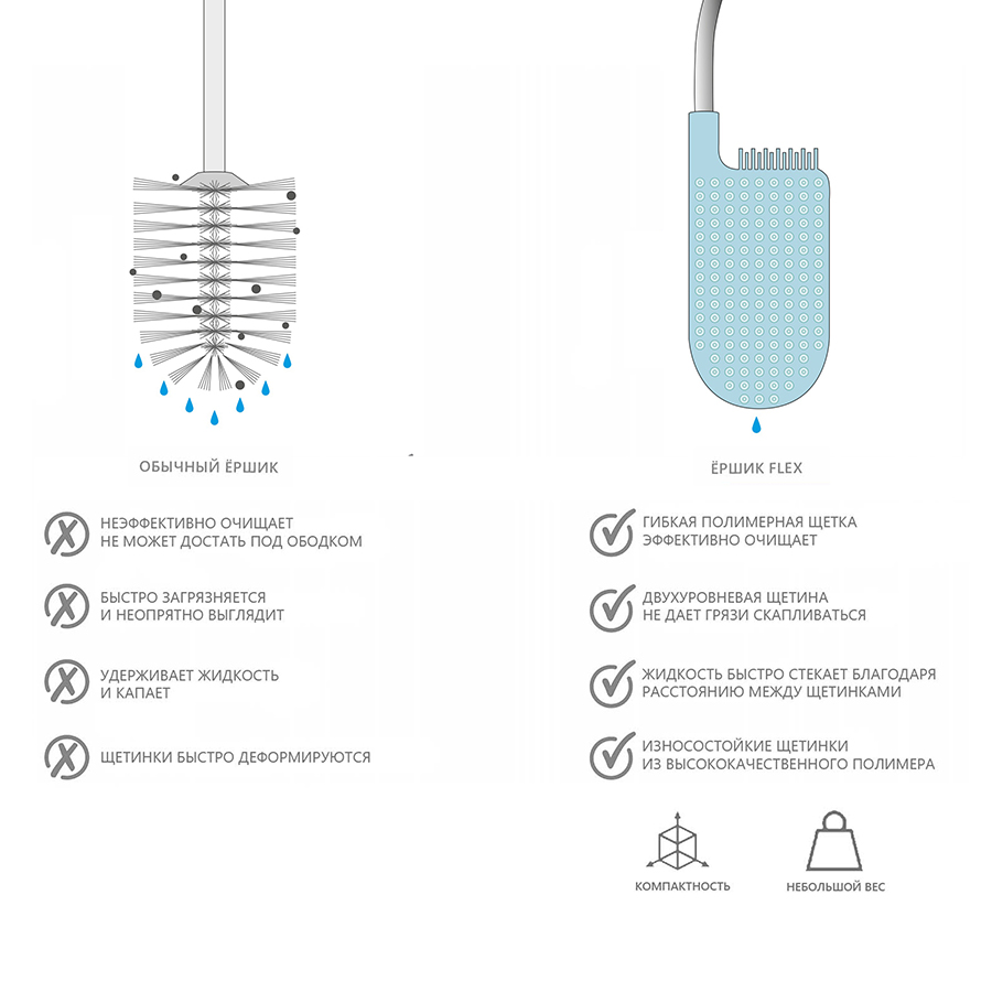 Гибкая полимерная щетка эффективно очищает все труднодоступные места и не впитывает воду. Особенность ёршика – практичная конструкция с защитой от засорения. Широкое расстояние между щетинками не дает грязи скапливаться. После уборки ёршик не надо стряхивать, пытаясь очистить и высушить, благодаря уникальному дизайну Flex™, вода быстро стекает со щетки и не оставляет лишних капель. Удобная и компактная подставка оснащена специальным многофункциональным отсеком, который можно использовать для хранения аэрозолей, моющих средств и туалетной бумаги. Таким образом, они будут спрятаны от постороннего глаза, но останутся под рукой. , ,При уборке с отбеливающим средством стоит избегать его попадания на ручку из нержавеющей стали.