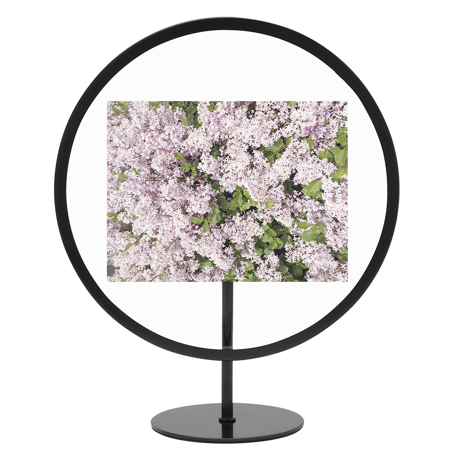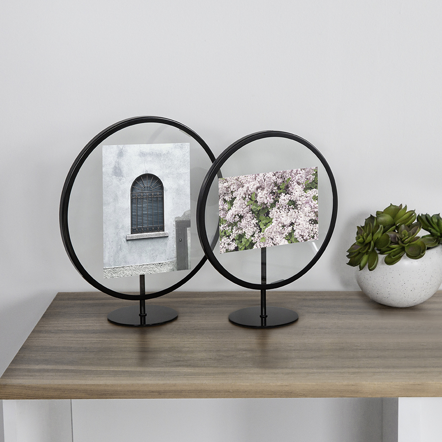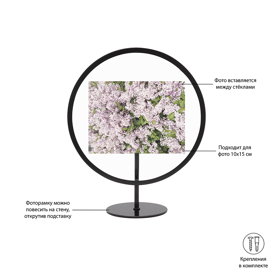Конструкция изделия позволяет размещать фотографию между двух стеклянных панелей, тем самым защищая ее загрязнения и выгорания. Корпус круглой формы выполнен из качественного металла, стойкого к коррозии и ультрафиолетовым лучам. Фоторамку можно прикрепить к стене или поставить на стол, полку или комод.