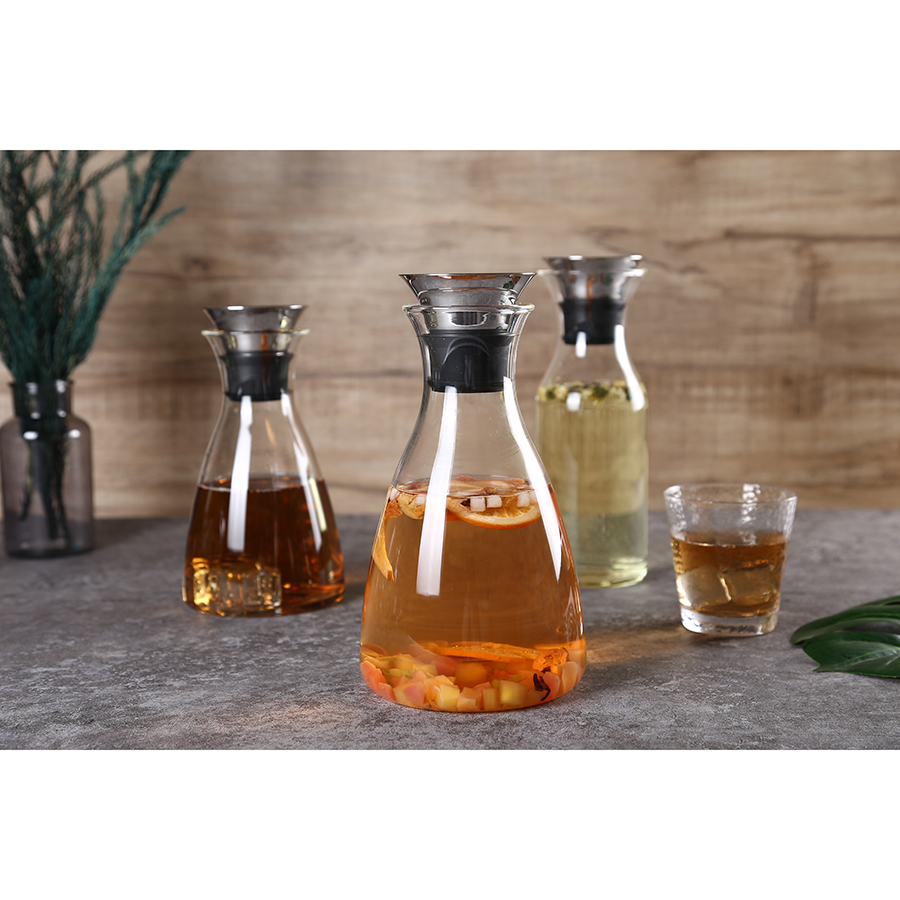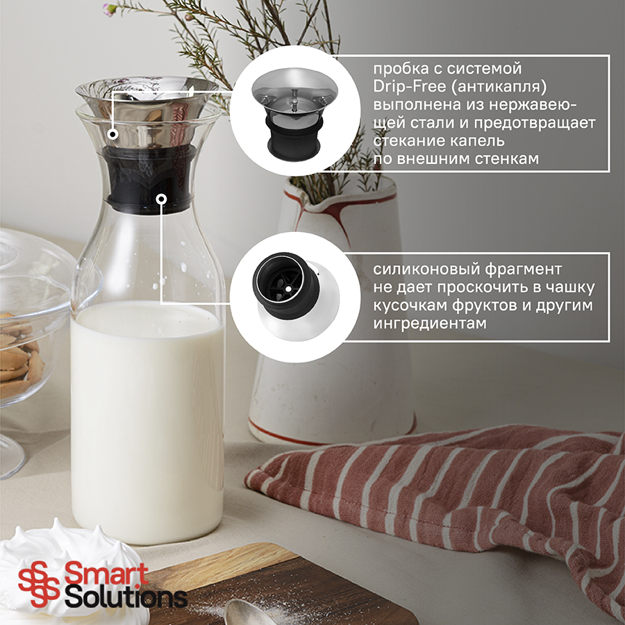 Двойное горлышко удобно при наливании: ни одна капля не упадет на стол. Силиконовый фрагмент не дает проскочить в чашку кусочкам фруктов другим ингредиентам. Графин идеально подходит для горячих напитков. Боросиликатное стекло выдерживает температуры от -70°С до 530°С.