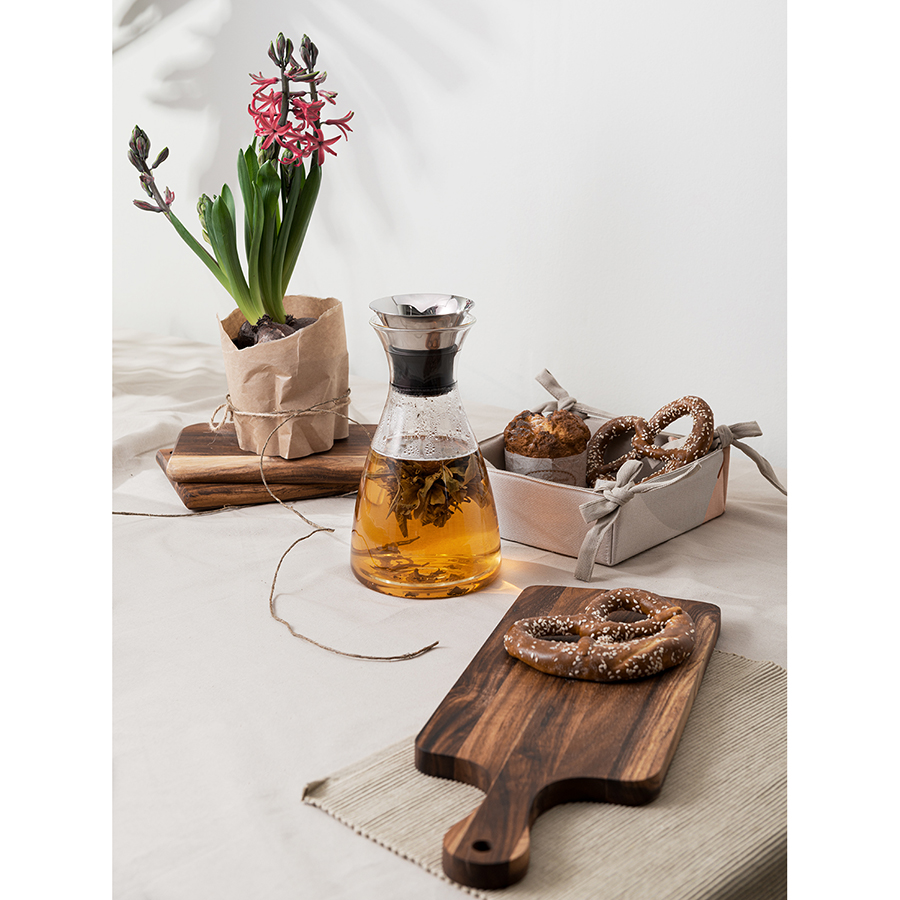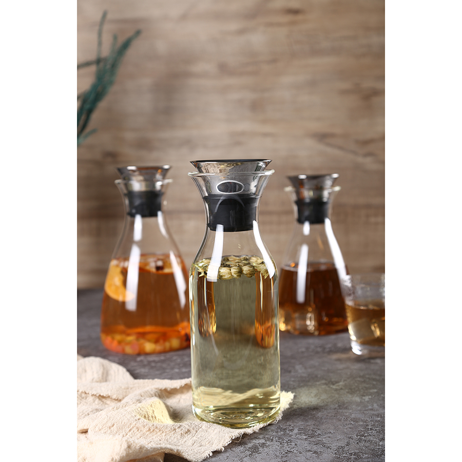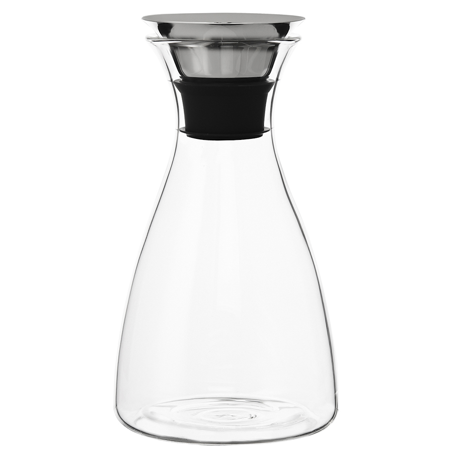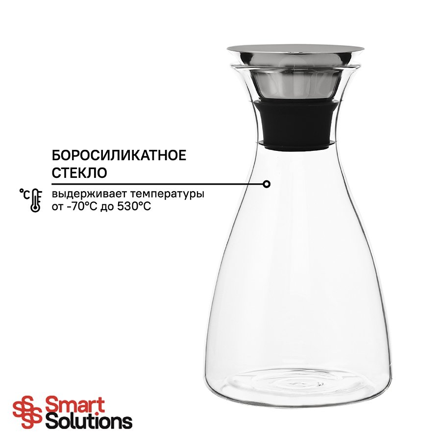 Двойное горлышко удобно при наливании: ни одна капля не упадет на стол. Силиконовый фрагмент не дает проскочить в чашку кусочкам фруктов другим ингредиентам. Графин идеально подходит для горячих напитков. Боросиликатное стекло выдерживает температуры от -70°С до 530°С.