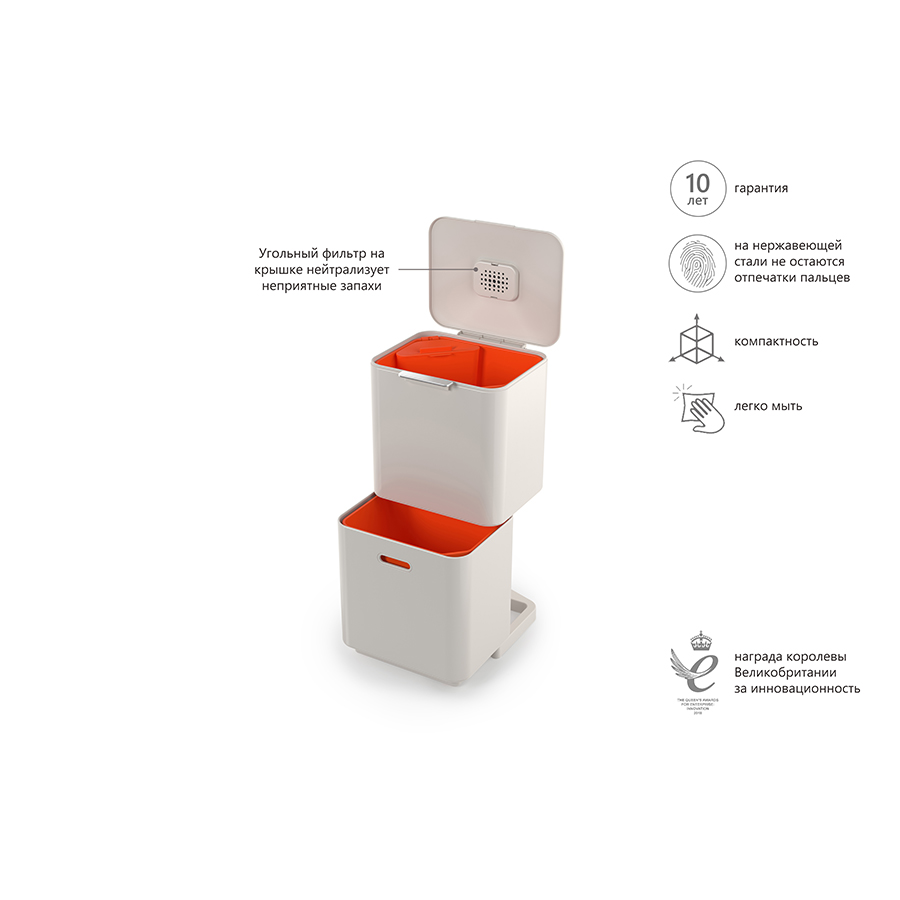 Вертикальное расположение баков позволит максимально сэкономить пространство на кухне. Отделения представляют собой вместительные контейнеры из низкоуглеродистой стали, для которых можно использовать как стандартные, так и специально разработанные пакеты. Конструкция позволяет надежно закреплять внутри мусорные пакеты, а вентилируемые отверстия помогают быстро извлекать их по мере наполнения. Верхний бак дополнен съемным контейнером для пищевых отходов, который плотно закрывается крышкой. Хранить его можно как внутри отсека, так и на рабочей поверхности. Нижний бак может использоваться не только для накопления мусора, но и хранения пакетов и хозяйственных принадлежностей. Внешняя крышка снабжена удобной кнопкой для легкого открывания контейнера. Также внутри нее крепится угольный фильтр, который эффективно блокирует неприятные запахи. К контейнеру Totem Compact можно отдельно приобрести сменные фильтры и мусорные пакеты IW6 и IW2. Общий объем: 60 л. Гарантия производителя: 10 лет.
