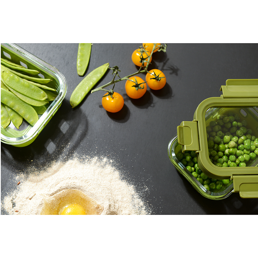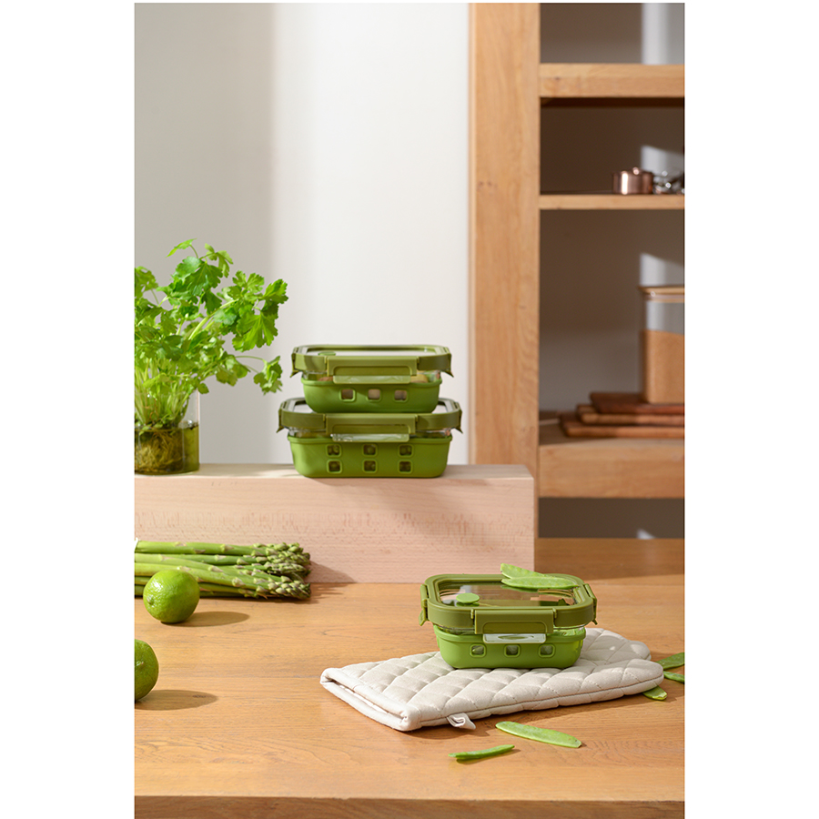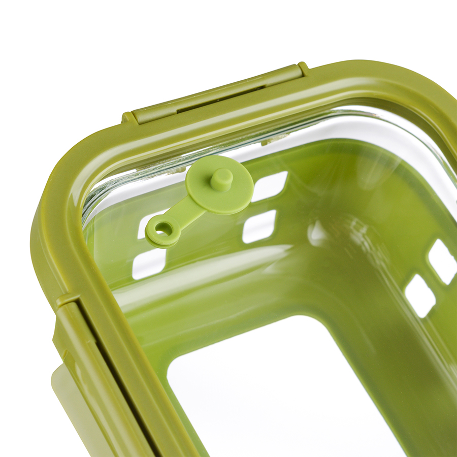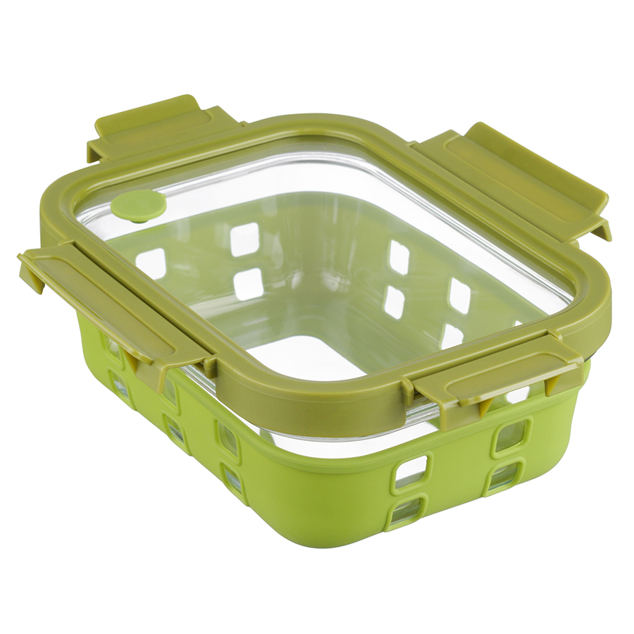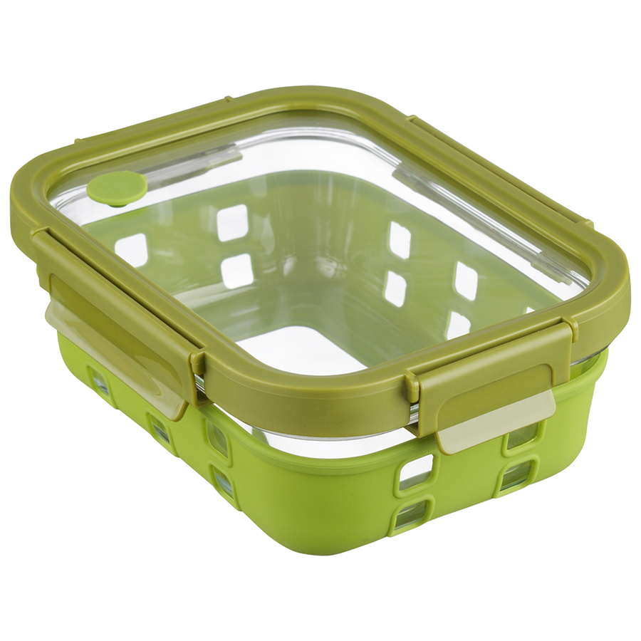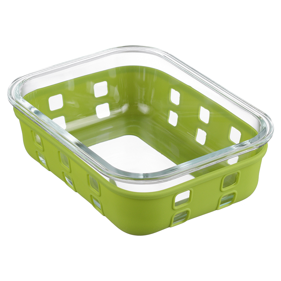 Контейнер стеклянный в чехле из силикона отлично подходит для хранения, запекания и транспортировки продуктов, в том числе готовых блюд. Емкость из боросиликатного стекла не впитывает запахи и загрязнения, легко моется. Крышка с надежными пластиковыми замками на каждой стороне обеспечивает плотное закрывание. Материалы не содержат бисфенол-А и являются абсолютно безопасными для здоровья. Наличие специального вентиляционного отверстия позволяет выпустить лишний воздух или горячий пар, что повышает герметичность и улучшает условия хранения продуктов. Силиконовый чехол без труда снимается для более тщательной очистки контейнера.