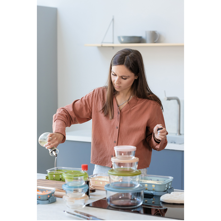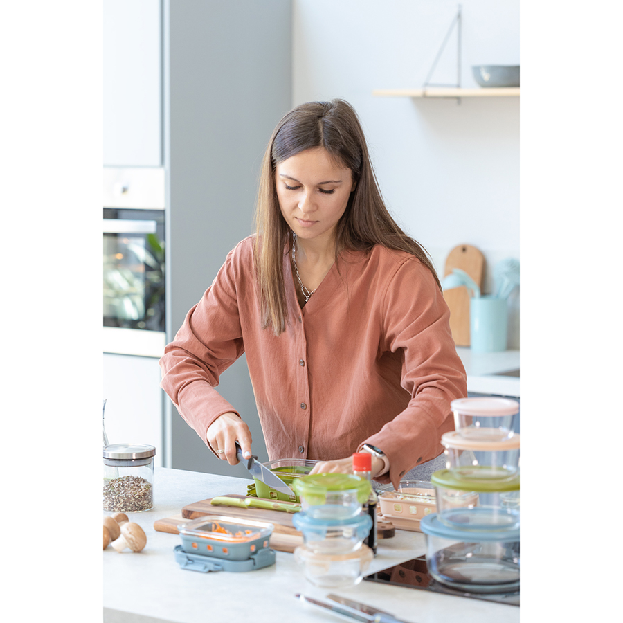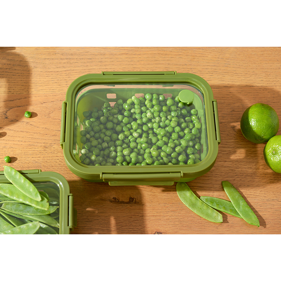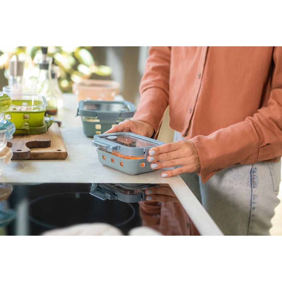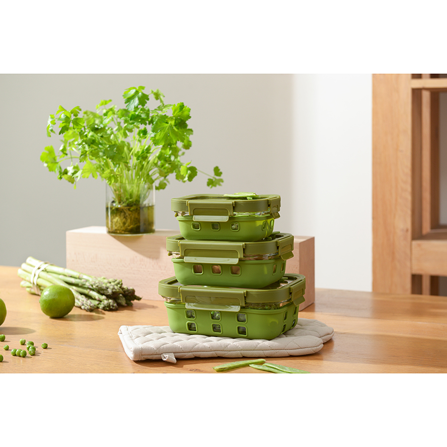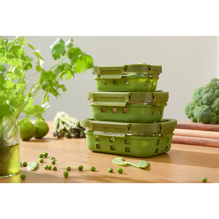 Контейнер стеклянный в чехле из силикона отлично подходит для хранения, запекания и транспортировки продуктов, в том числе готовых блюд. Емкость из боросиликатного стекла не впитывает запахи и загрязнения, легко моется. Крышка с надежными пластиковыми замками на каждой стороне обеспечивает плотное закрывание. Материалы не содержат бисфенол-А и являются абсолютно безопасными для здоровья. Наличие специального вентиляционного отверстия позволяет выпустить лишний воздух или горячий пар, что повышает герметичность и улучшает условия хранения продуктов. Силиконовый чехол без труда снимается для более тщательной очистки контейнера.