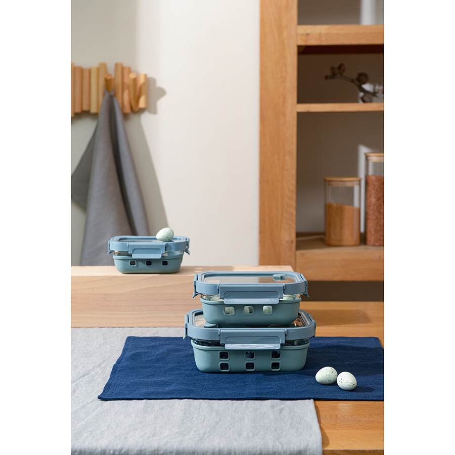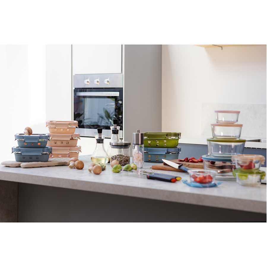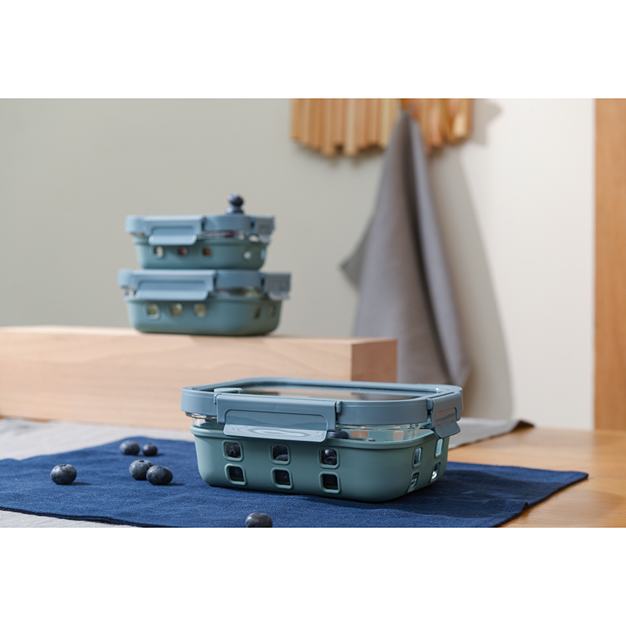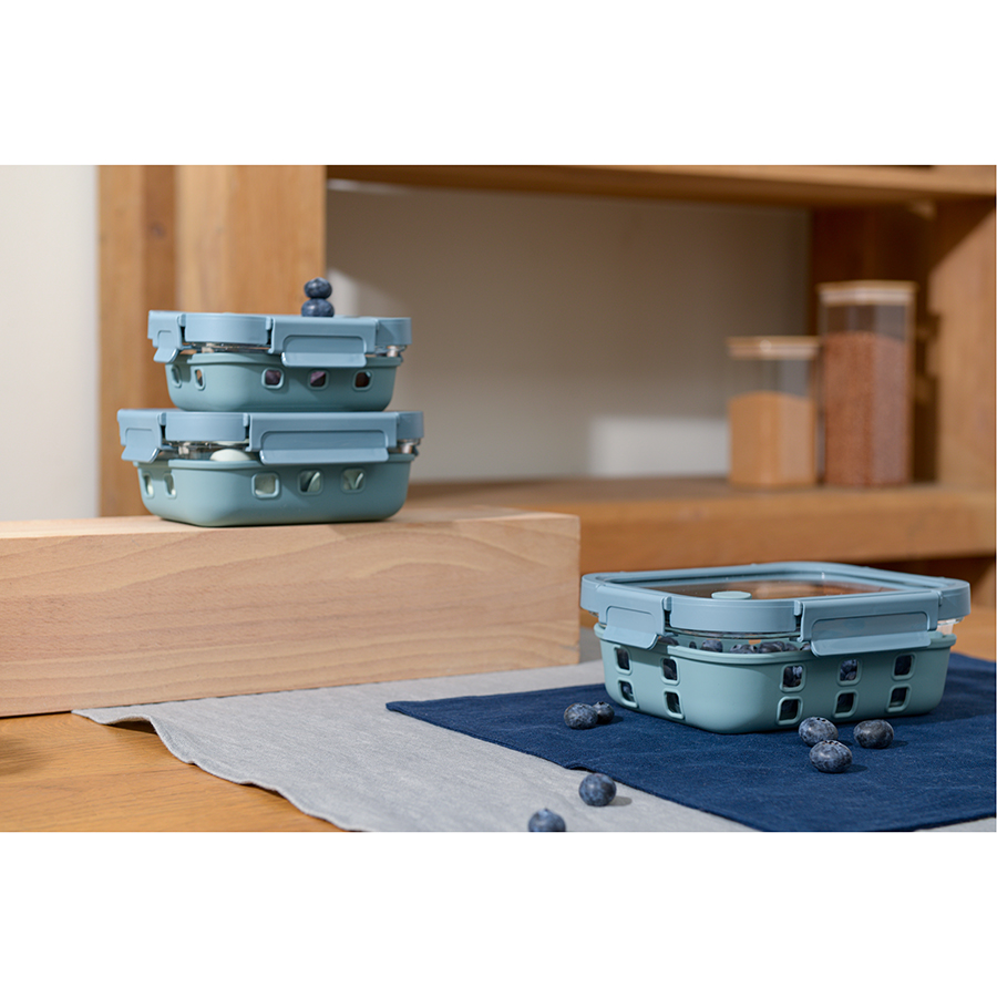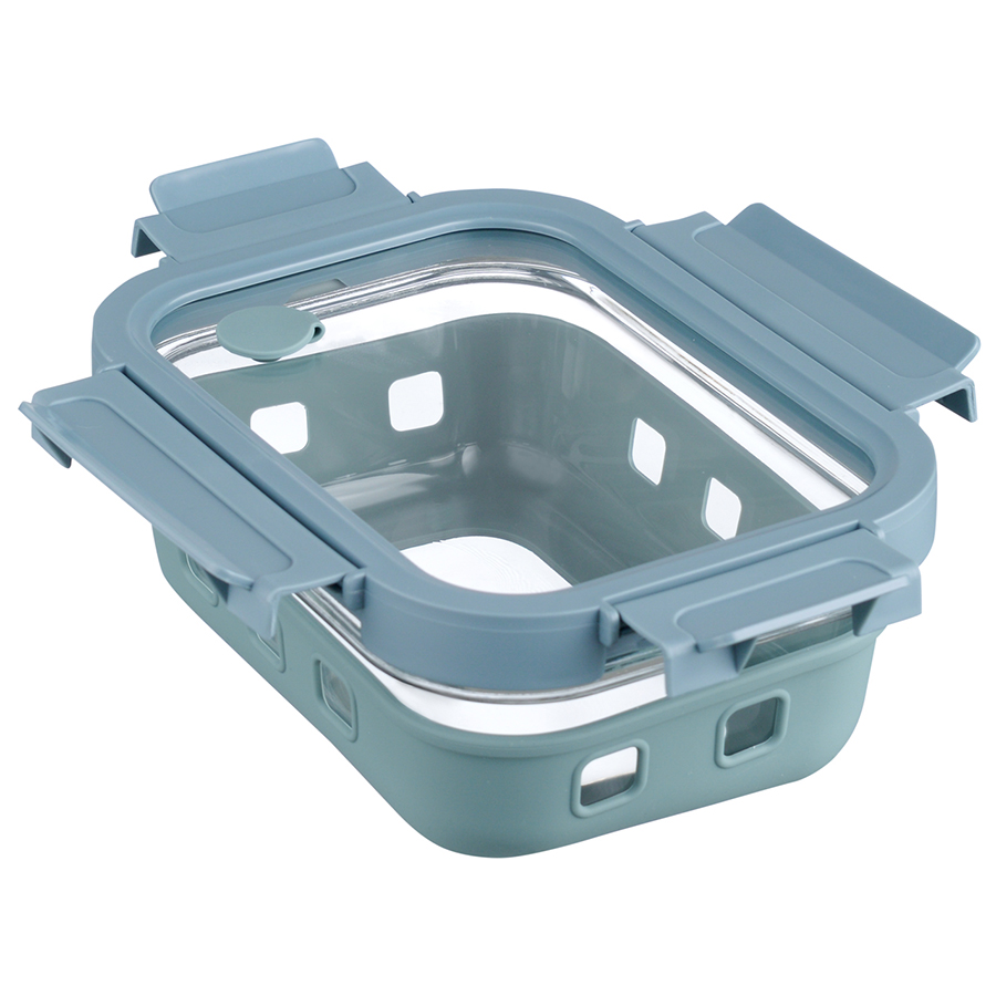 Контейнер стеклянный в чехле из силикона отлично подходит для хранения, запекания и транспортировки продуктов, в том числе готовых блюд. Емкость из боросиликатного стекла не впитывает запахи и загрязнения, легко моется. Крышка с надежными пластиковыми замками на каждой стороне обеспечивает плотное закрывание. Материалы не содержат бисфенол-А и являются абсолютно безопасными для здоровья. Наличие специального вентиляционного отверстия позволяет выпустить лишний воздух или горячий пар, что повышает герметичность и улучшает условия хранения продуктов. Силиконовый чехол без труда снимается для более тщательной очистки контейнера.