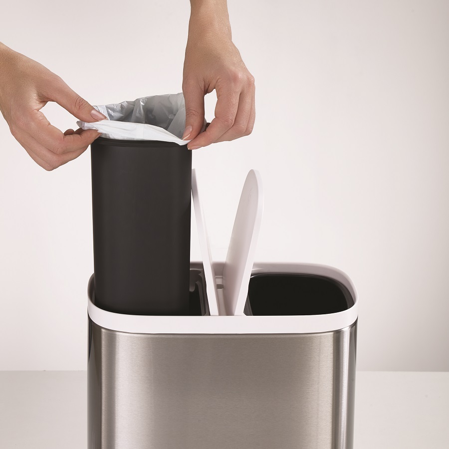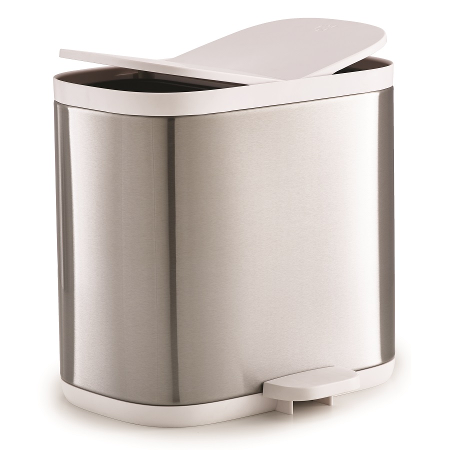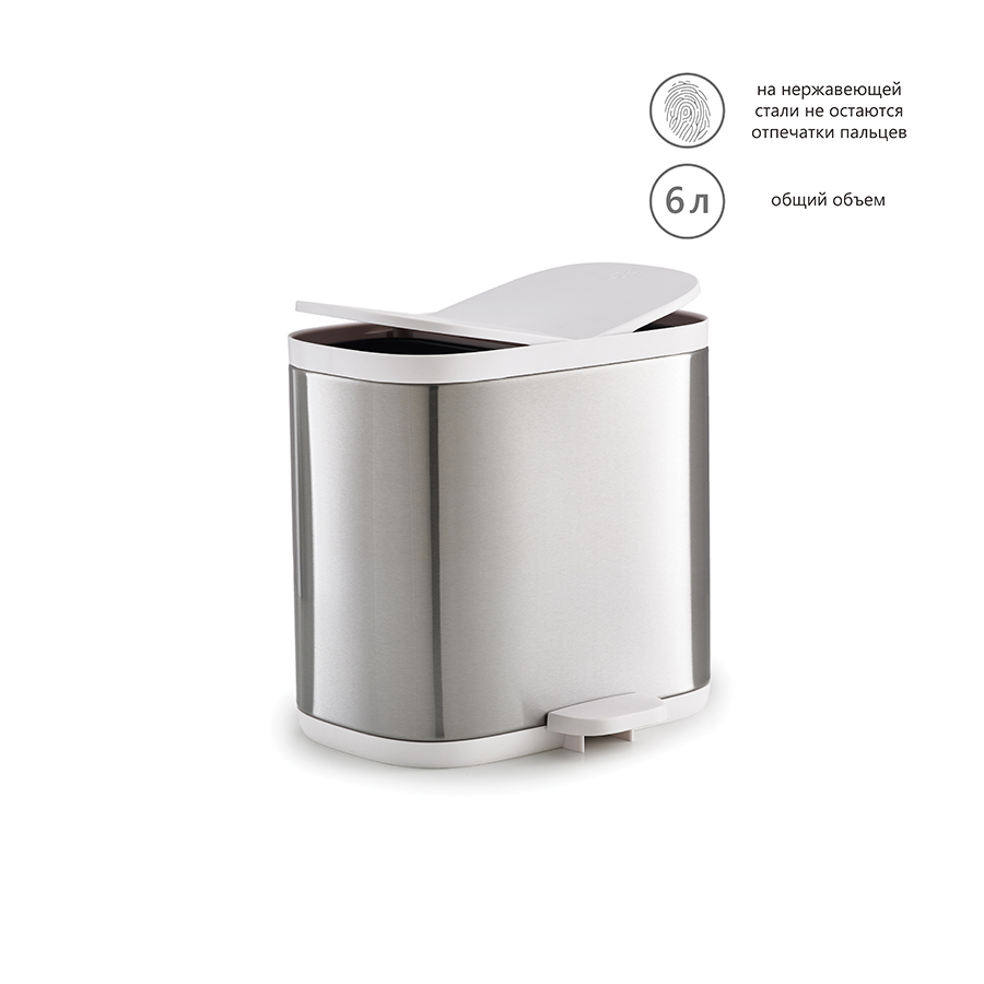 Внутренняя часть и крышка выполнены из эргономичного материала, который удобно протирать и мыть, корпус – из нержавеющей стали. Предусмотрены два отсека разных размеров. Бак можно использовать с дополнительными мешками для мусора или без – внутренняя часть контейнера легко вынимается для чистки. Общий объем контейнера – 6 литров.