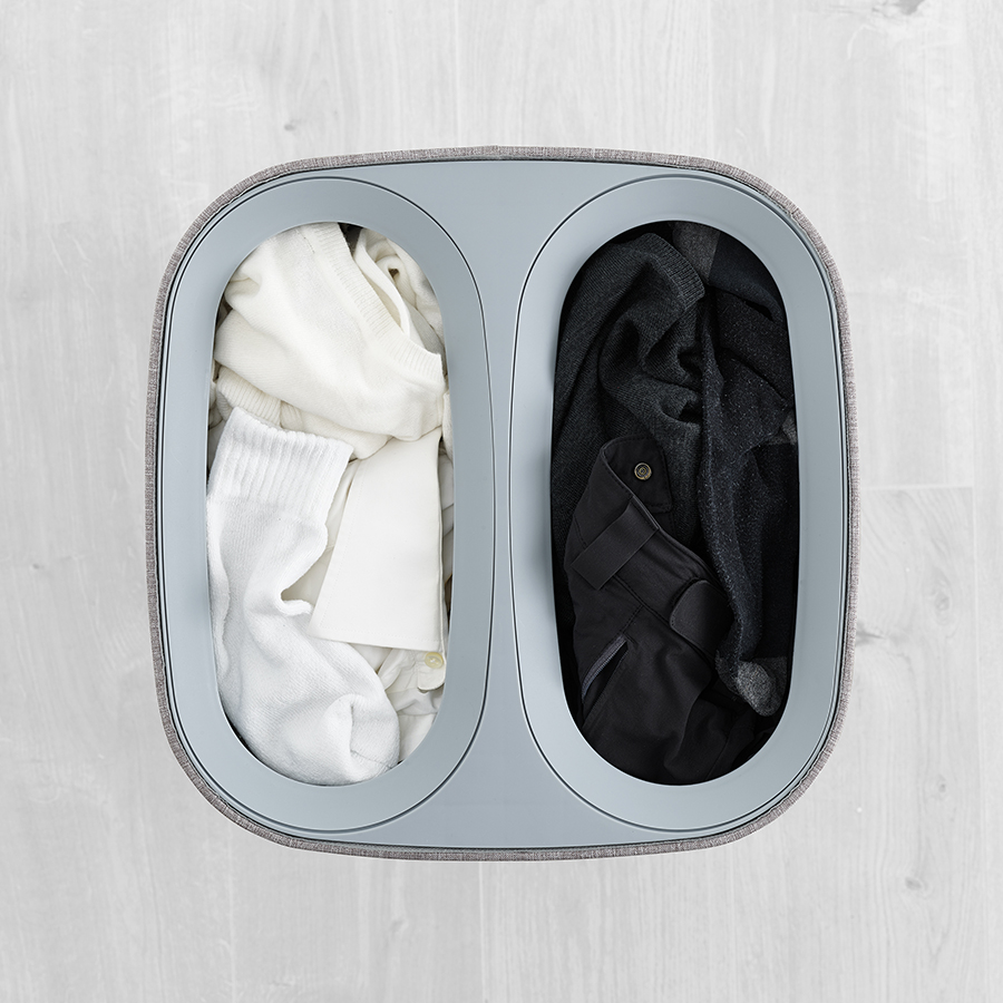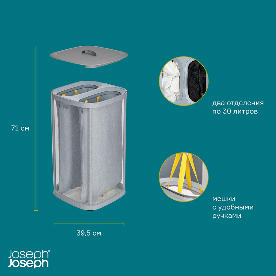 Корзина имеет два отделения по 30 литров, которые помогут разделить светлое и цветное/черное белье. Мешки с удобными ручками легко снимаются. Дополнительные ручки на дне мешков помогают высыпать содержимое наружу. Корзина поставляется с полной инструкцией по сборке.