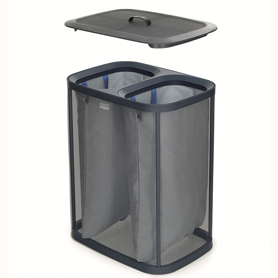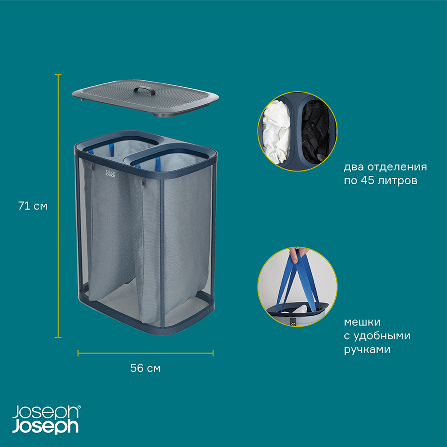 Корзина имеет два отделения по 45 литров, которые помогут разделить светлое и цветное/черное белье. Мешки с удобными ручками легко снимаются. Дополнительные ручки на дне мешков помогают высыпать содержимое наружу. Корзина поставляется с полной инструкцией по сборке.