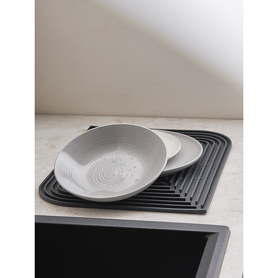 - Имеет специальную ребристую поверхность, которая уберегает посуду от падения, задерживает и позволяет легко слить стекающую воду.