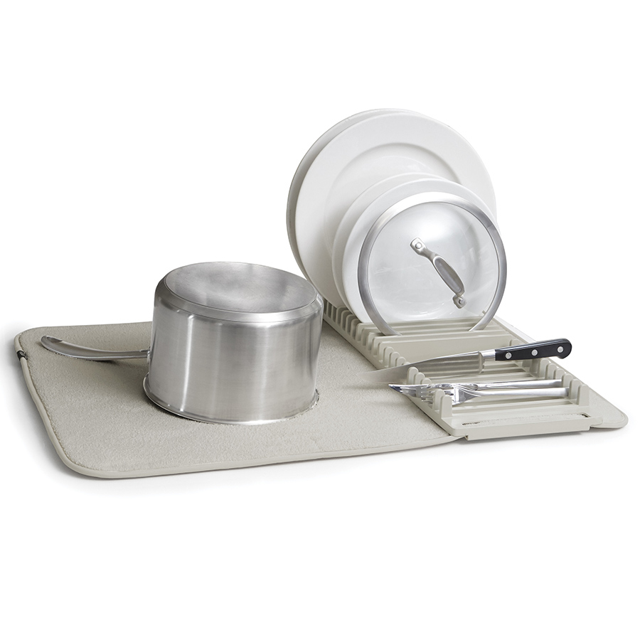 Коврик из микрофибры удобен для сушки чашек, стаканов и глубоких мисок, а подставка — для тарелок и блюдец. Аксессуар можно легко разобрать для чистки и компактно сложить для хранения, закрепив с помощью эластичных ремешков. Размеры: 61х46 см.