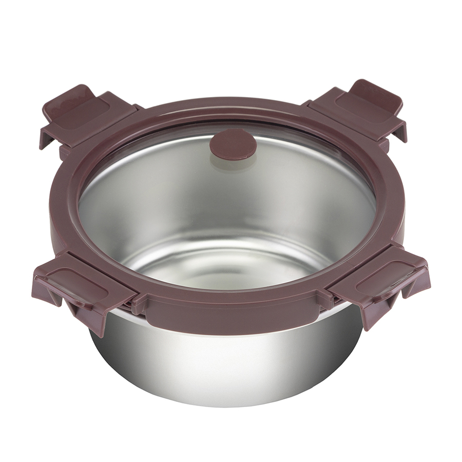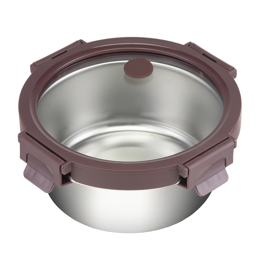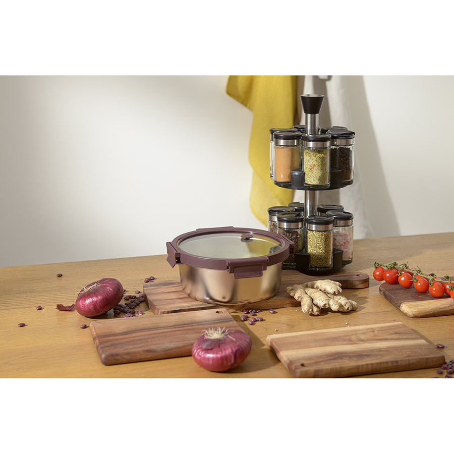Ланч-бокс из нержавеющей стали – стильная, практичная и надежная посуда для хранения и транспортировки еды. Материал не подвержен коррозии, не впитывает запахи и загрязнения, долго сохраняет привлекательный вид. Крышка из прочного боросиликатного стекла легко выдерживает перепады температуры, имеет специальные фиксаторы, которые помогают избежать протечек. Наличие вентиляционного отверстия позволяет выпустить из контейнера лишний воздух или горячий пар, что повышает герметичность и улучшает условия хранения продуктов. Благодаря компактным размерам емкость не занимает много места в сумке. Ланч-бокс можно смело брать с собой на работу, в поездку или путешествие.
