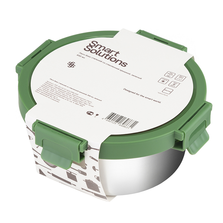 Ланч-бокс стальной со стеклянной крышкой, 650 мл, зеленый, Smart Solutions