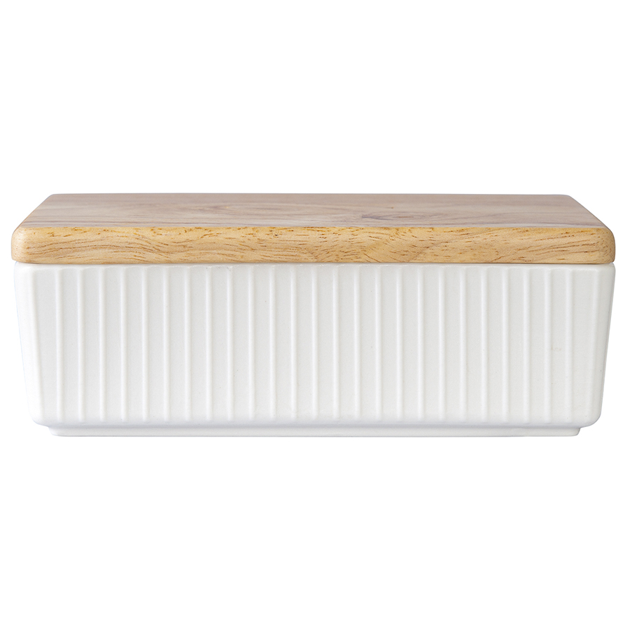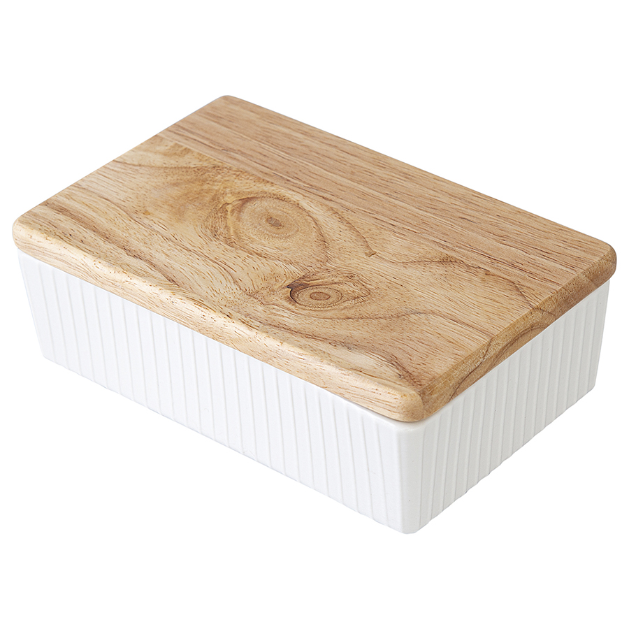 Масленка из коллекции Soft Ripples Dual Glazing имеет увеличенные размеры, что позволяет использовать ее для хранения больших пачек сливочного масла. Сочетание фарфора с двойной глазуровкой и бамбука обеспечивает изделию презентабельный вид и отличные эксплуатационные характеристики. Материалы неприхотливы в уходе, являются экологичными и безопасными для здоровья. Рельефный узор на внешней поверхности стенок делает дизайн оригинальным. Благодаря термостойкости материала емкость также можно использовать в качестве формы для запекания порционных блюд. А крышка из бамбука станет удобной сервировочной доской для подачи масла.