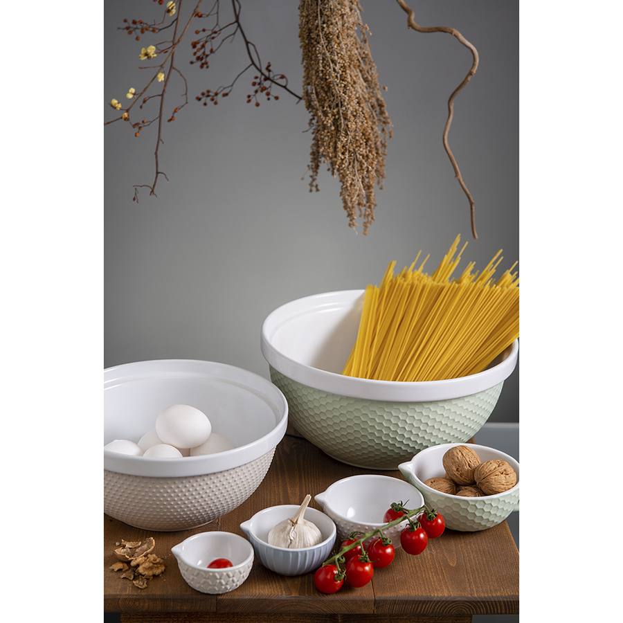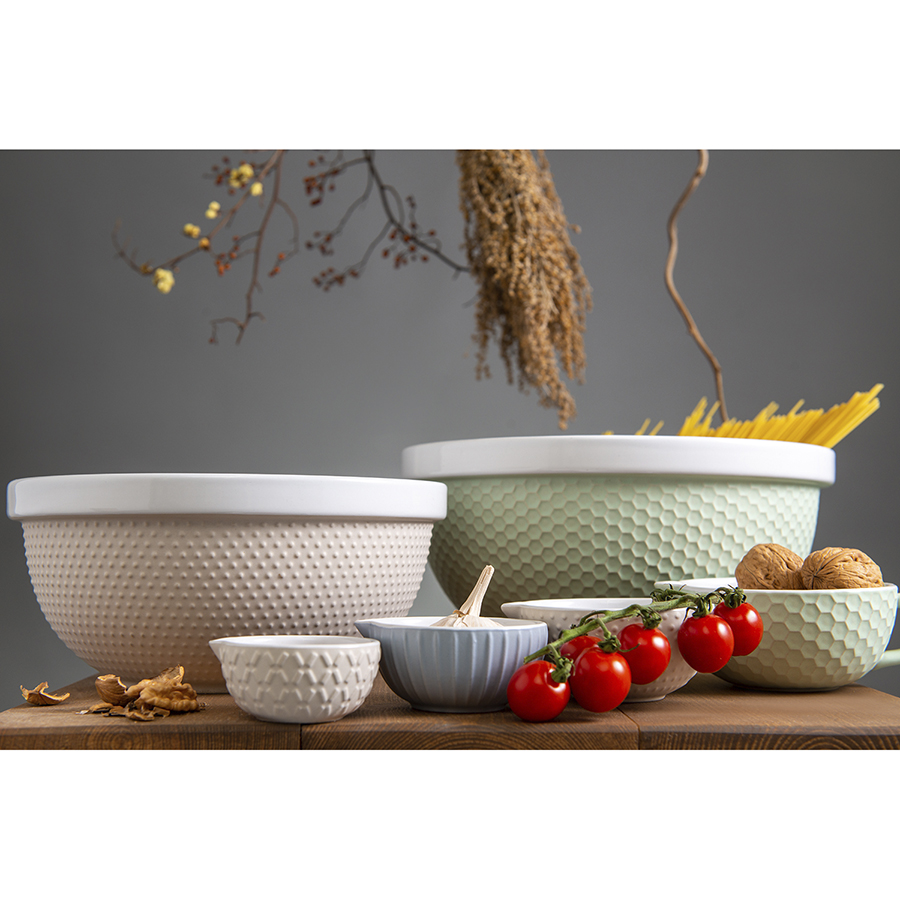 Миски не предназначены для использования металлического венчика и миксера. Желательно использовать венчик с силиконовым прутьями, силиконовую лопатку или деревянные ложки.