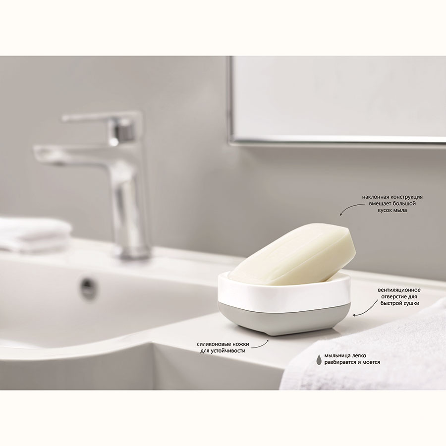 Мыло размещается в мыльнице не горизонтально, а под углом, благодаря чему излишки воды стекают в специальное отверстие и его поверхность быстро высыхает. Мыло будет дольше служить и при этом оставаться в хорошем состоянии. Вентиляционные отверстия обеспечивают поток воздуха, благодаря чему поверхность мыльницы остается сухой. Также конструкция легко разбирается, поэтому поддерживать ее в чистоте не составит труда. На дне мыльницы есть специальные силиконовые ножки. Этот материал не скользит по гладким поверхностям, что придает мыльнице дополнительную устойчивость.
