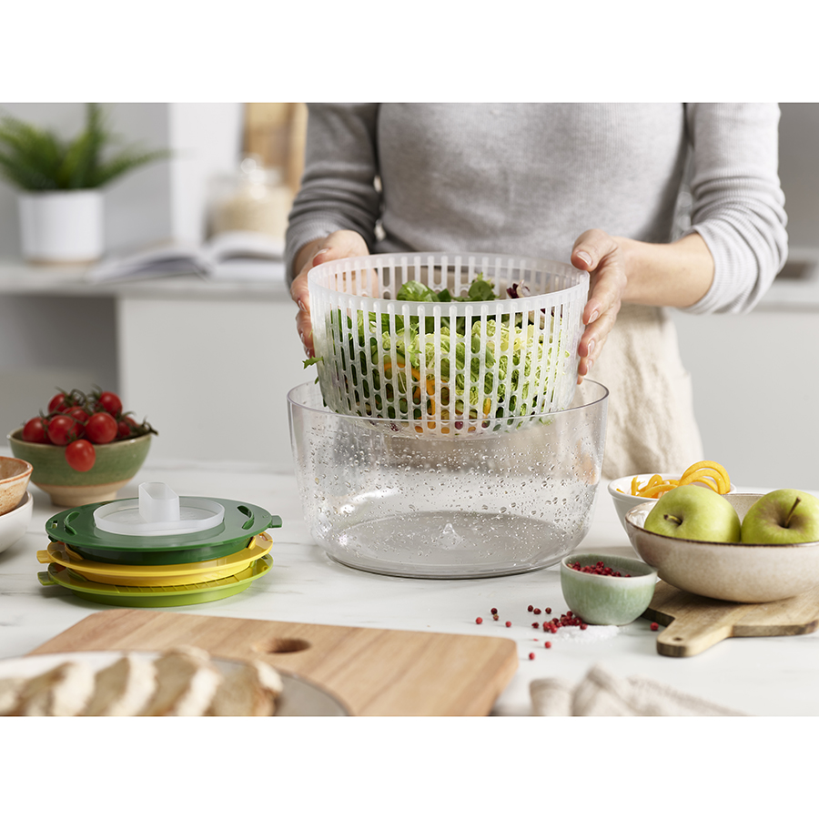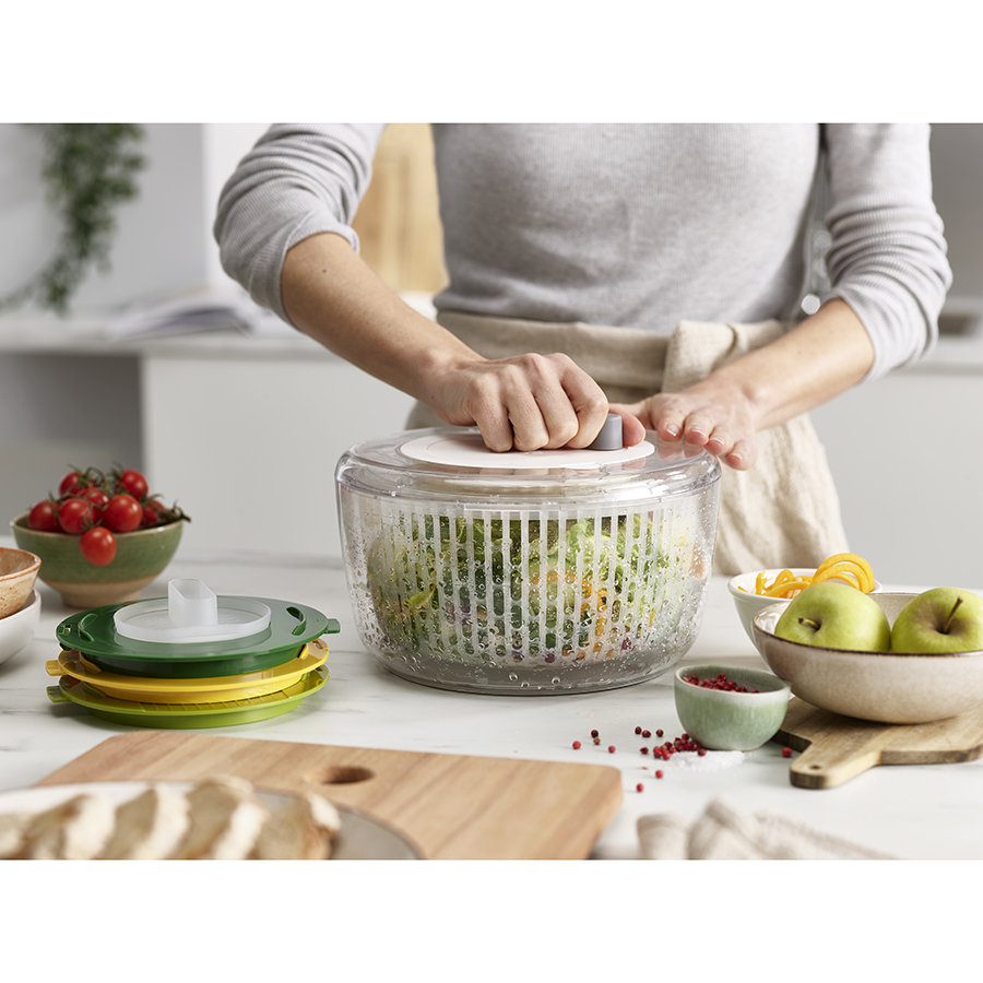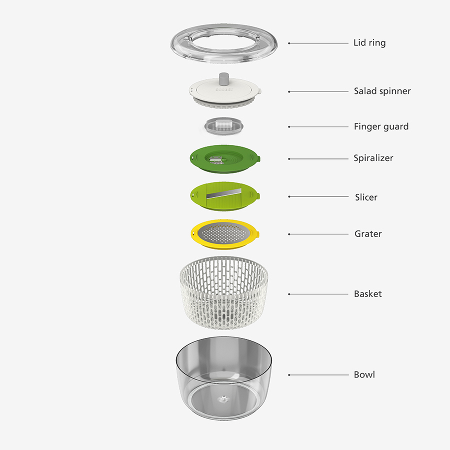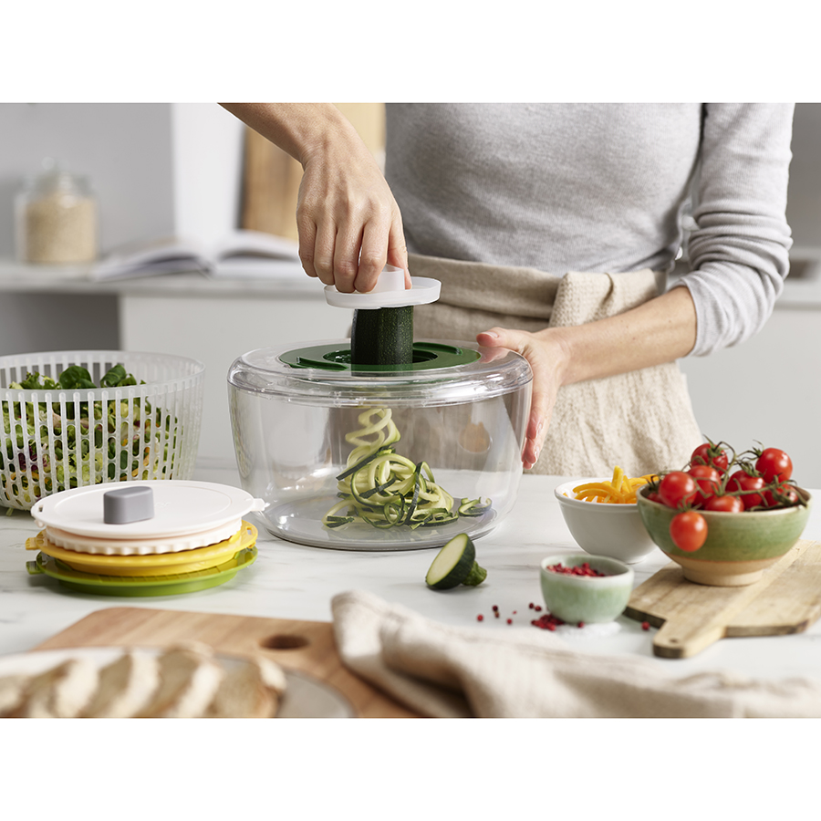 Набор включает четыре сменных диска для различных задач по приготовлению салатов: сушилка, спиралайзер, слайсер и терка. Набор имеет нескользящее основание и специальную защиту для пальцев. Материал не содержит бисфенола-А. Аксессуары штабелируются внутри основной емкости для компактного хранения.