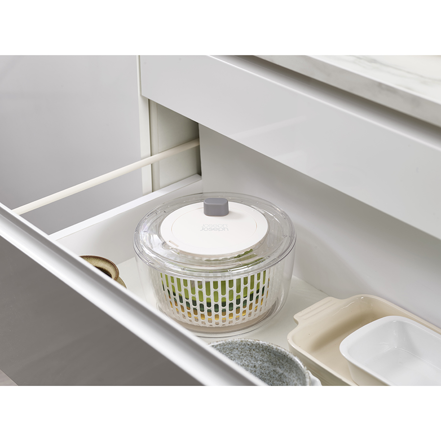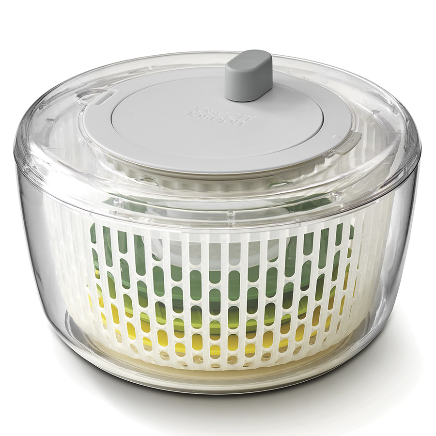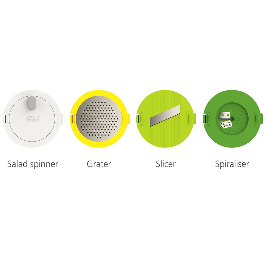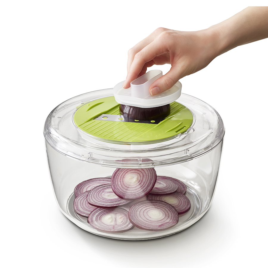Набор включает четыре сменных диска для различных задач по приготовлению салатов: сушилка, спиралайзер, слайсер и терка. Набор имеет нескользящее основание и специальную защиту для пальцев. Материал не содержит бисфенола-А. Аксессуары штабелируются внутри основной емкости для компактного хранения.