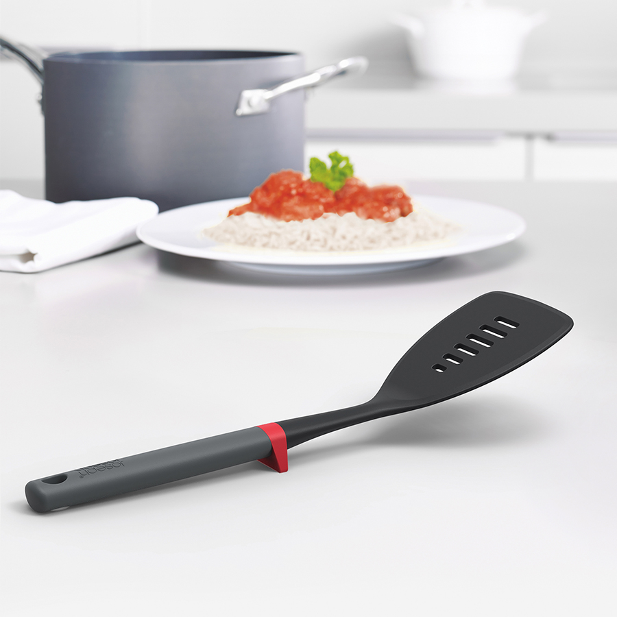 В набор входит лопатка для переворачивания и сервировки продуктов, универсальная ложка для перемешивания во время приготовления, а также ложка-шумовка. Ручки инструментов оснащены специальной подножкой, чтобы лопатки и ложки держались на весу, благодаря чему испачканная часть не коснётся рабочей поверхности. Все аксессуары входят в серию кухонных приборов DUO, разработанную для поддержания максимального порядка во время приготовления блюд.