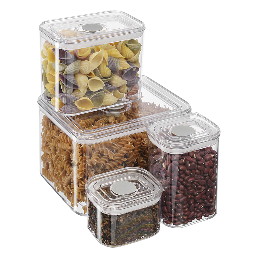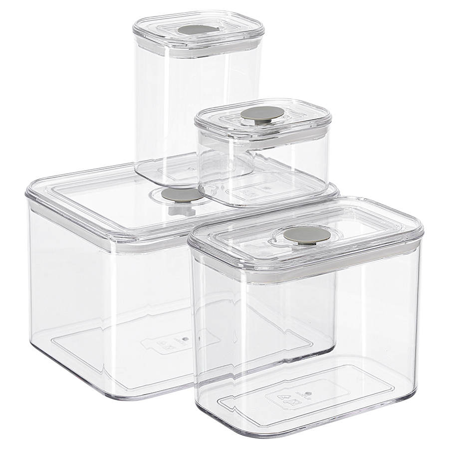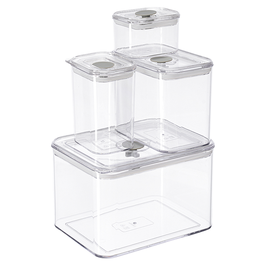 Материалы: пластик SAN, силикон. Размеры: 9х7х6 см, 9х7х11,5 см, 14,5х9х11,5 см, 18,5х14,5х11,5 см. Объемы: 190 мл, 440 мл, 1л, 2,3 л. Количество в наборе: 4 шт.