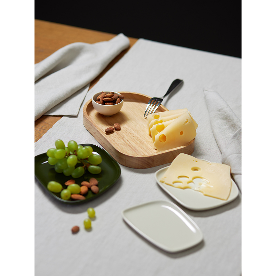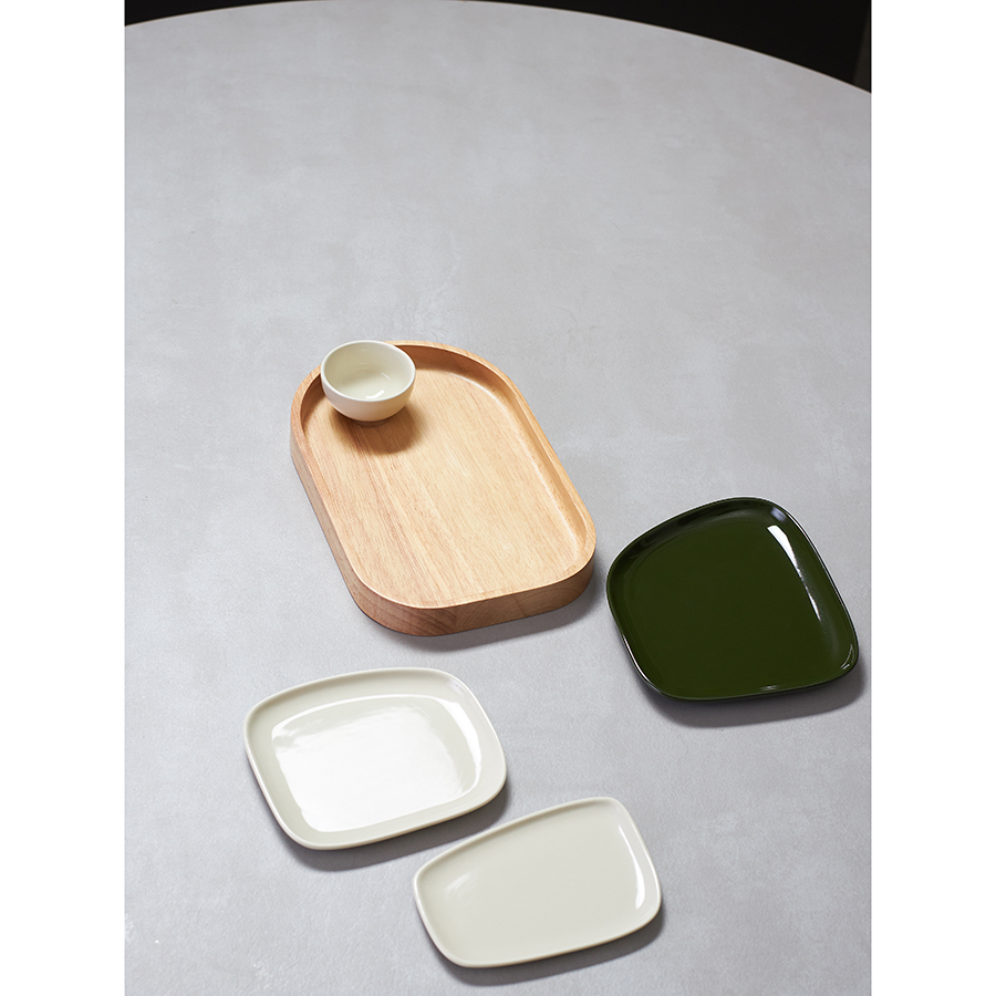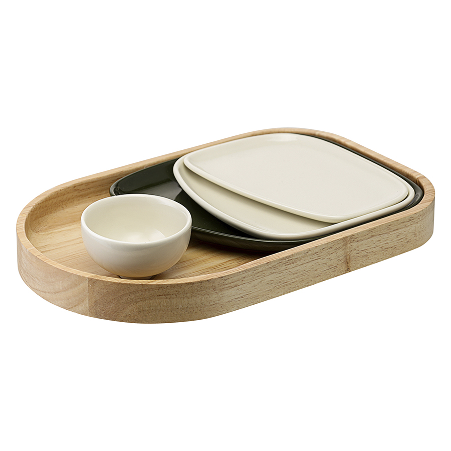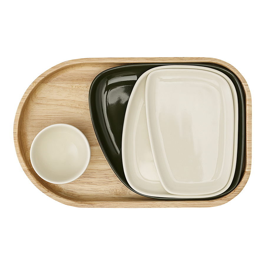 Материалы: тарелки – фарфор, поднос – каучуковое дерево. Размеры тарелок: 12,5х15х1,4 см, 14х12,3х1,1 см, 13,7х9х1 см. Размеры чаши: 6,4х5,8х3,8 см. Объем чаши: 44 мл. Размеры подноса: 25,8х16,5х2,5 см. Количество предметов в наборе: 5 шт.