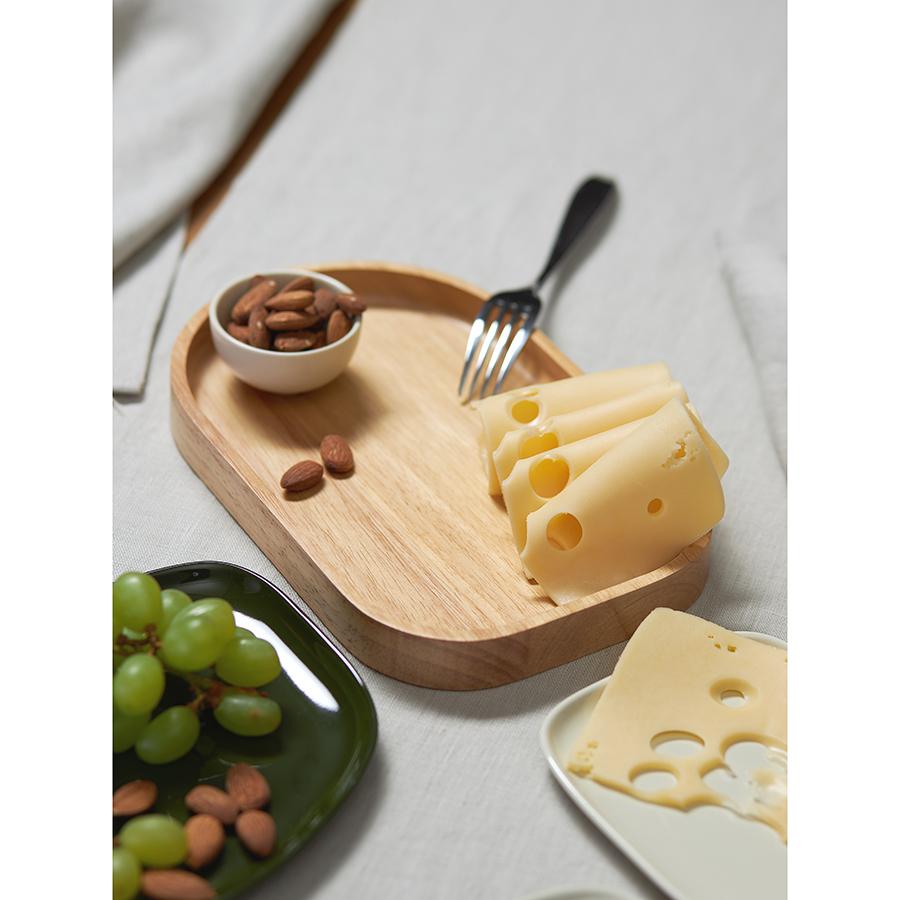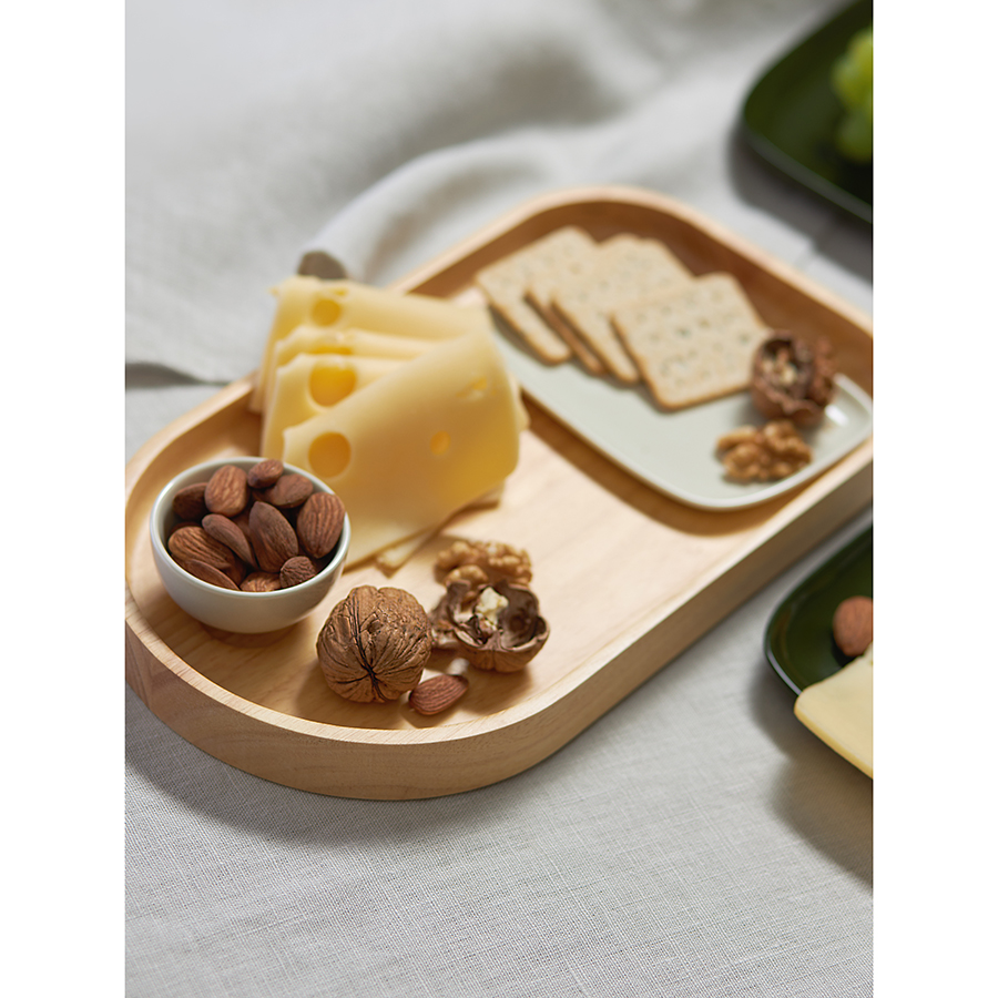 - Деревянный поднос имеет надежную цельную конструкцию с высокими бортиками, что предотвращает скольжение тарелок и продуктов.