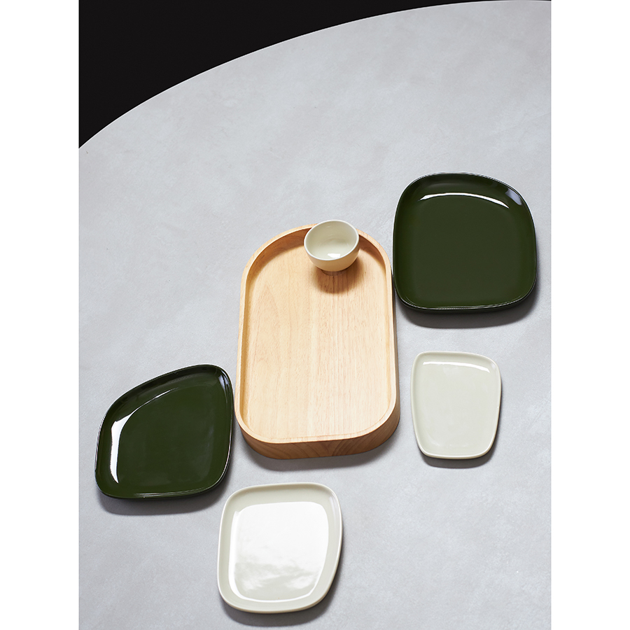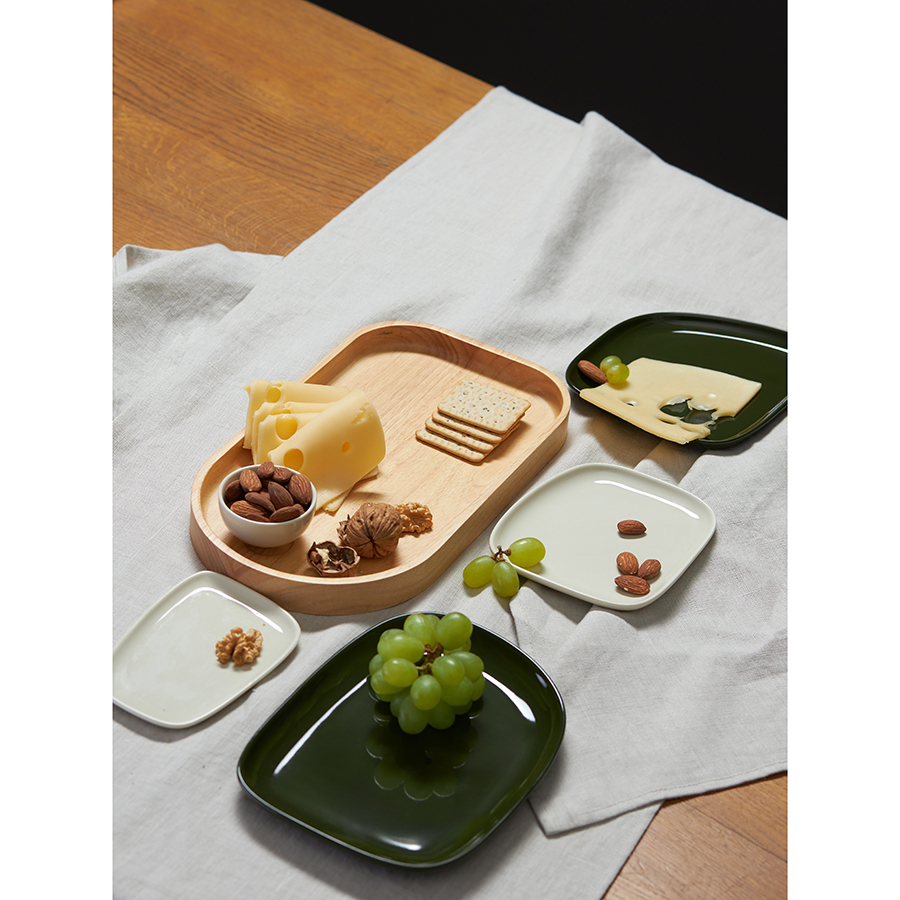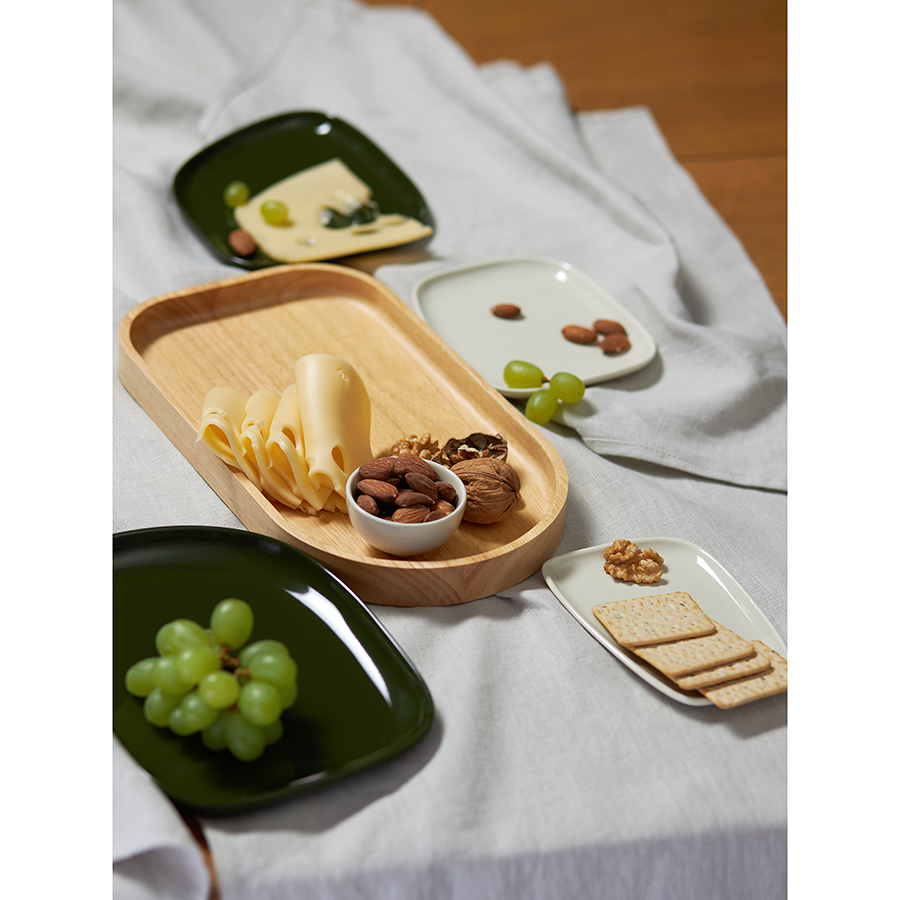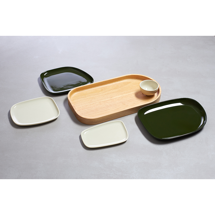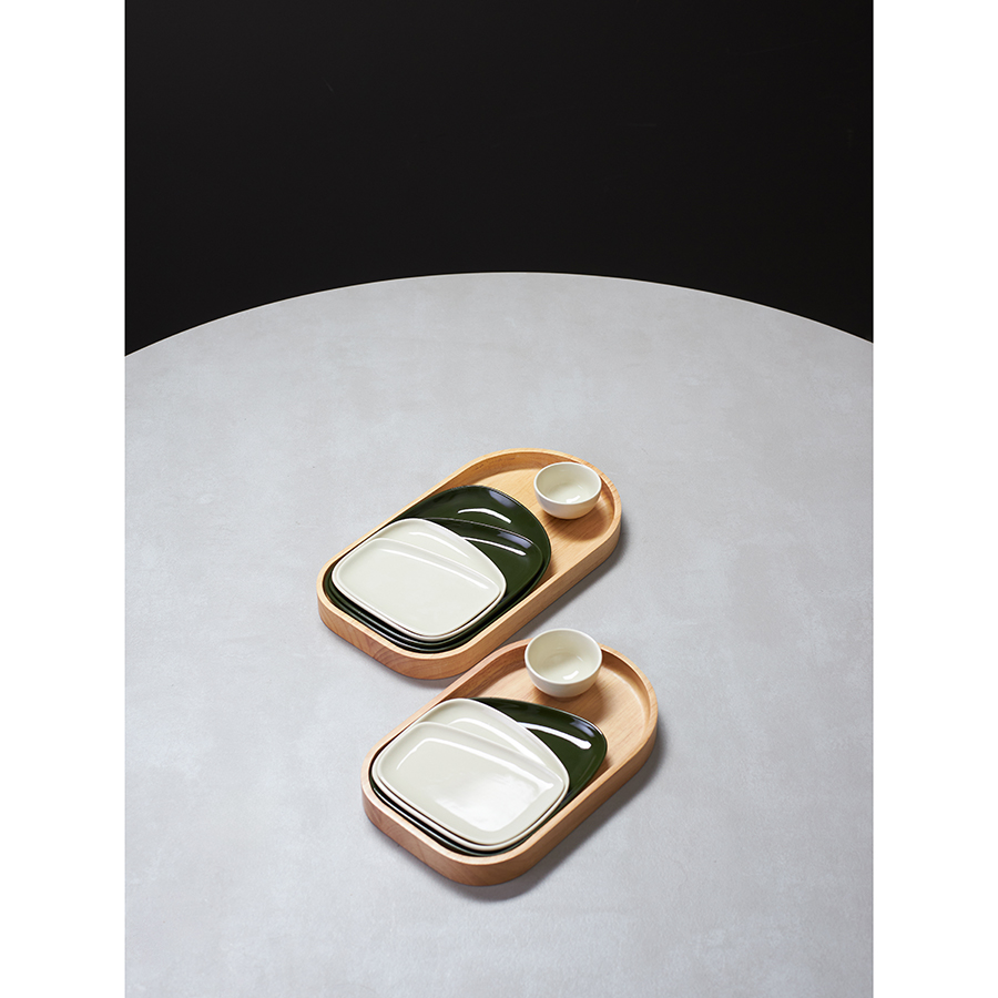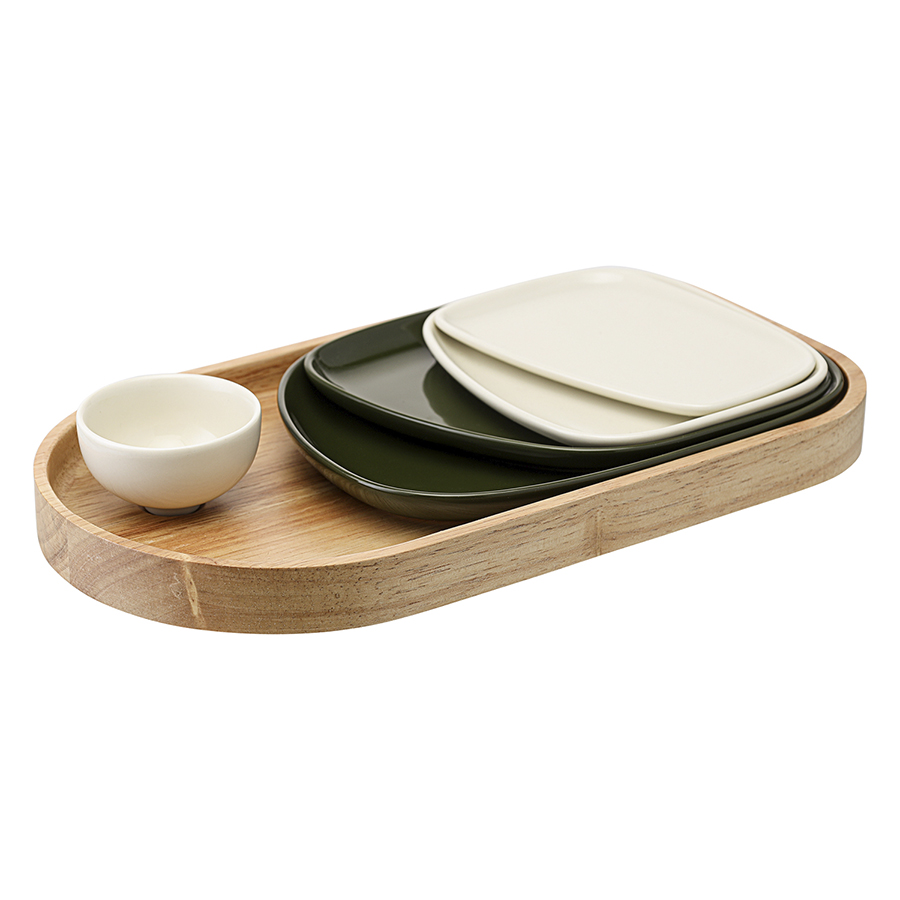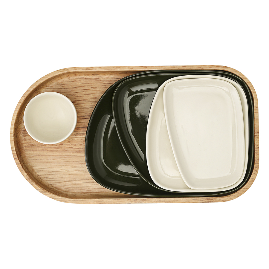 Материалы: тарелки – фарфор, поднос – каучуковое дерево. Размеры тарелок: 20х15х1,5 см, 17х15х1,4 см, 14х12,3х1,1 см, 13,7х9х1 см. Размеры чаши: 6,4х5,8х3,8 см. Объем чаши: 44 мл. Размеры подноса: 30,8х17,2х2,5 см. Количество предметов в наборе: 6 шт.