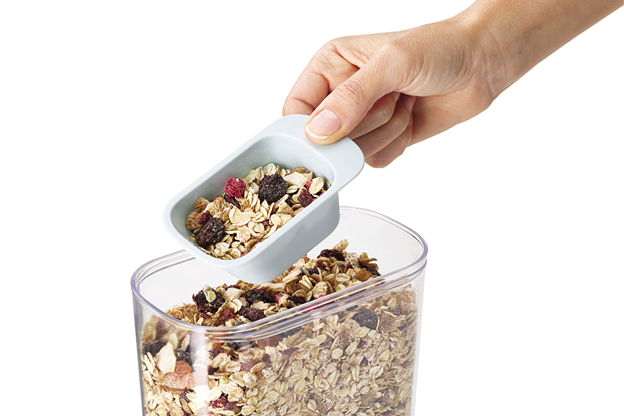 Контейнеры выполнены из прозрачного пластика, благодаря чему открывается отличная видимость и доступ к хранящимся продуктам. Герметичные крышки снабжены удобными язычками для открывания емкостей. К крышке большого контейнера прикреплен удобный совок объемом 125 мл. С его помощью можно легко отмерить необходимое количество овсяных хлопьев, сухофруктов, сахара и других продуктов.