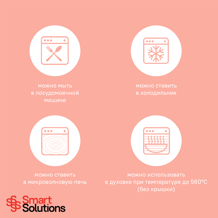 Можно мыть в посудомоечной машине, ставить в холодильник, микроволновую печь, использовать в духовке при температуре до 560?.