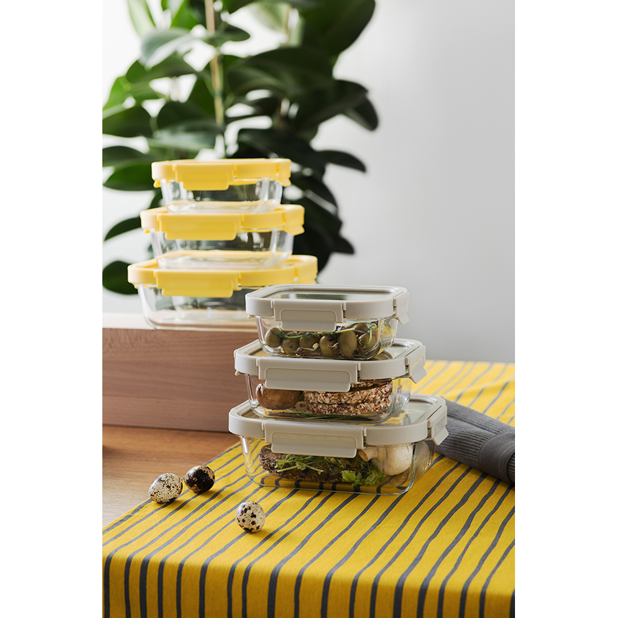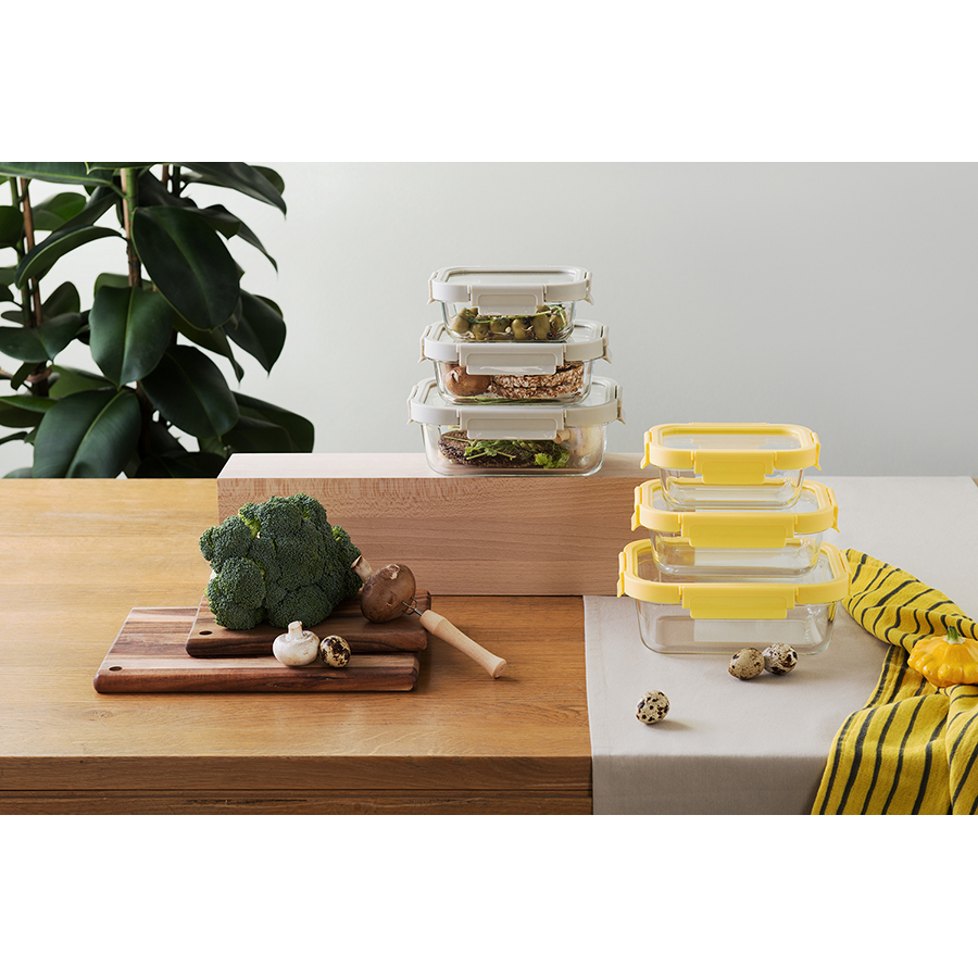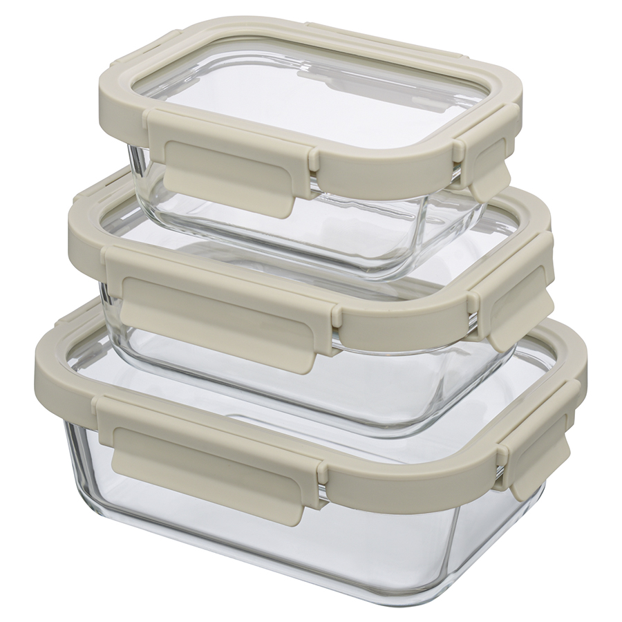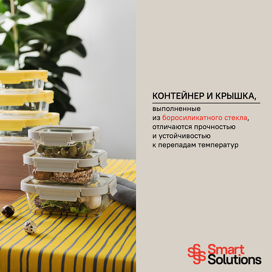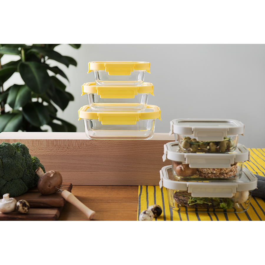Контейнеры выполнены из прочного боросиликатного стекла. Стеклянные крышки снабжены надежными закрывающимися механизмами, которые гарантируют 100%, герметичность. Материалы не содержат токсинов и бисфенола-А.