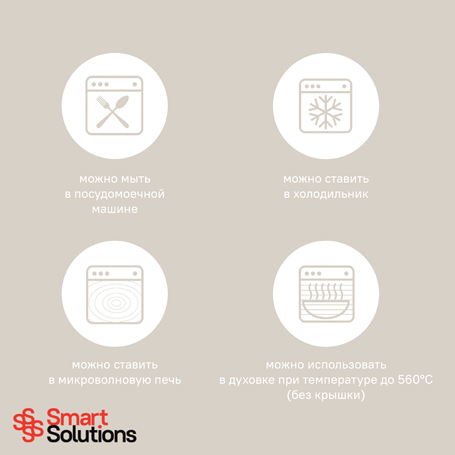 Можно мыть в посудомоечной машине, ставить в холодильник, микроволновую печь, использовать в духовке при температуре до 560?.