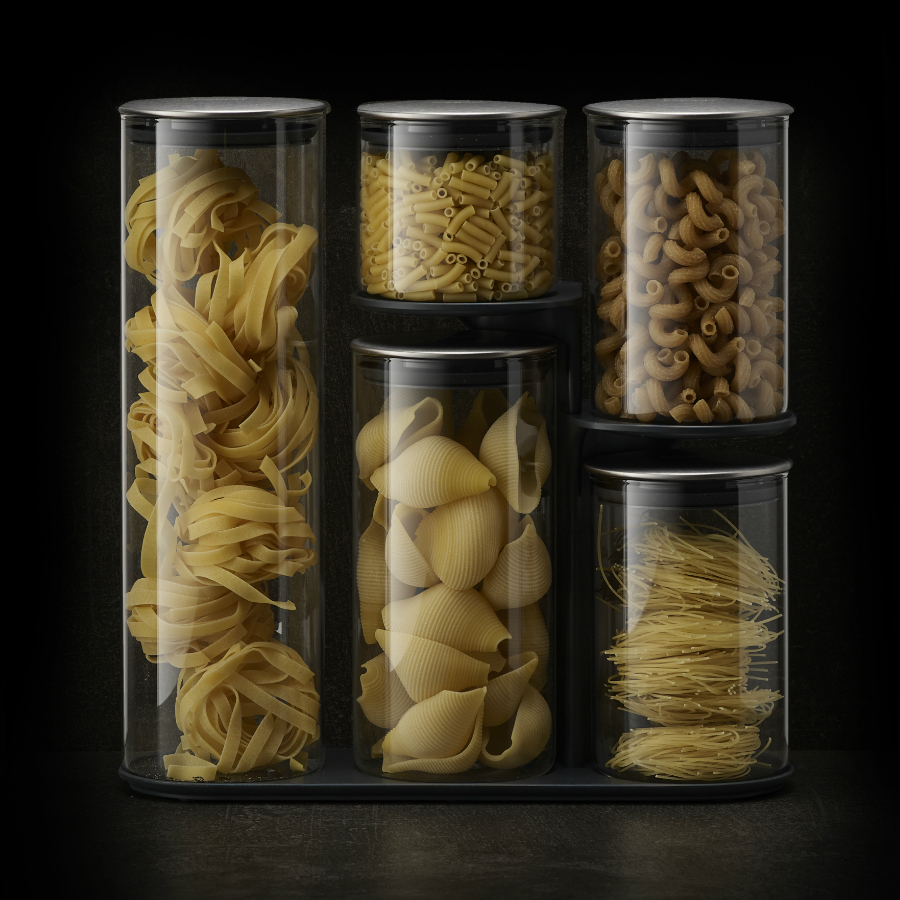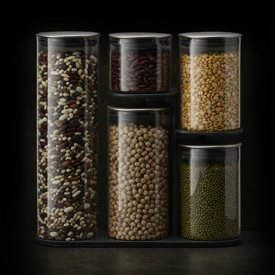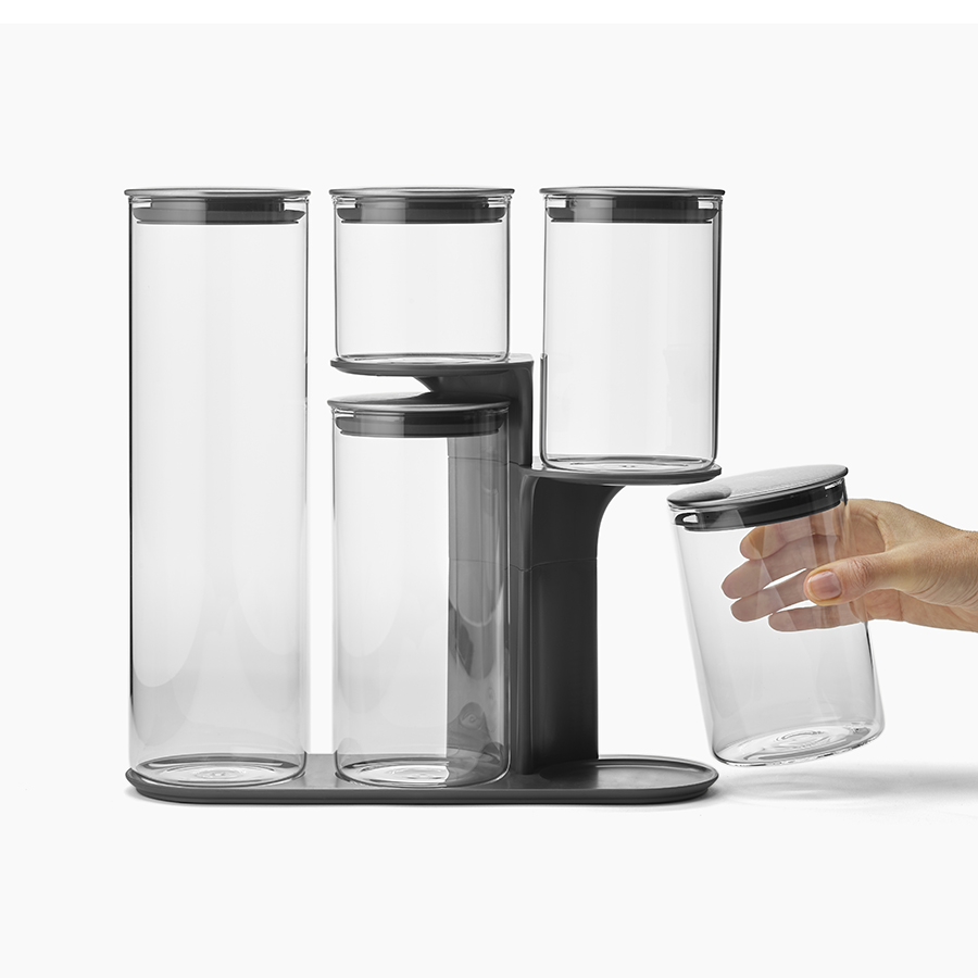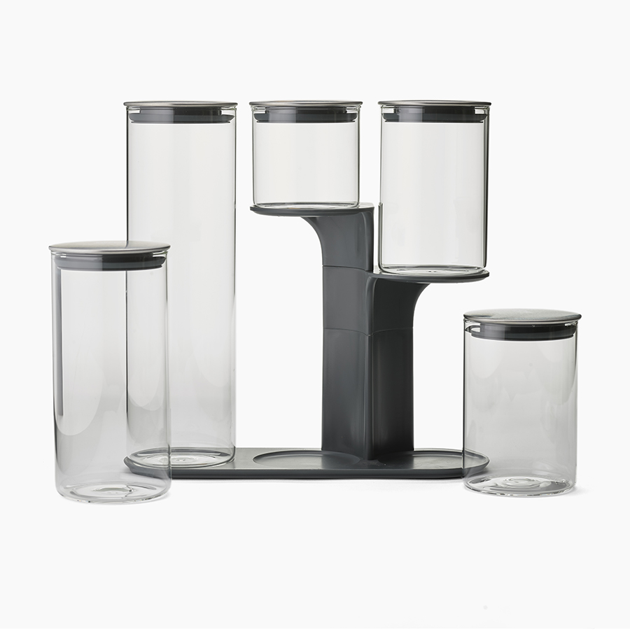 Эргономичная подставка позволяет сэкономить пространство на кухонной поверхности и обеспечивает легкий доступ к любой банке.