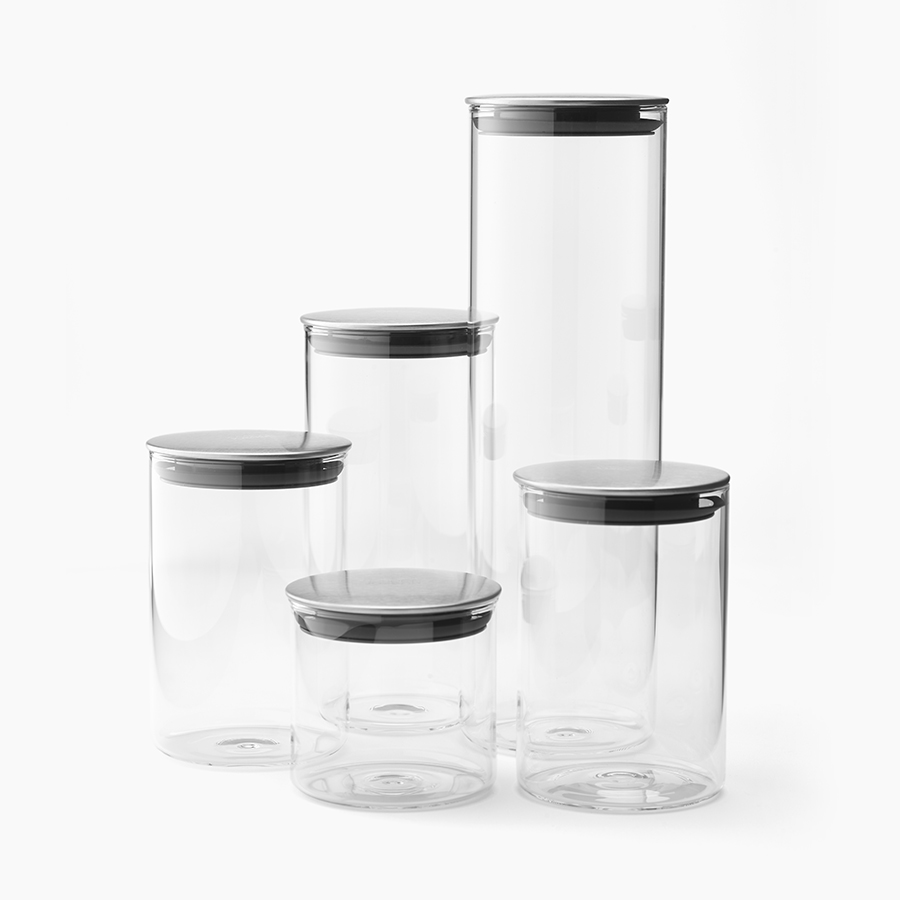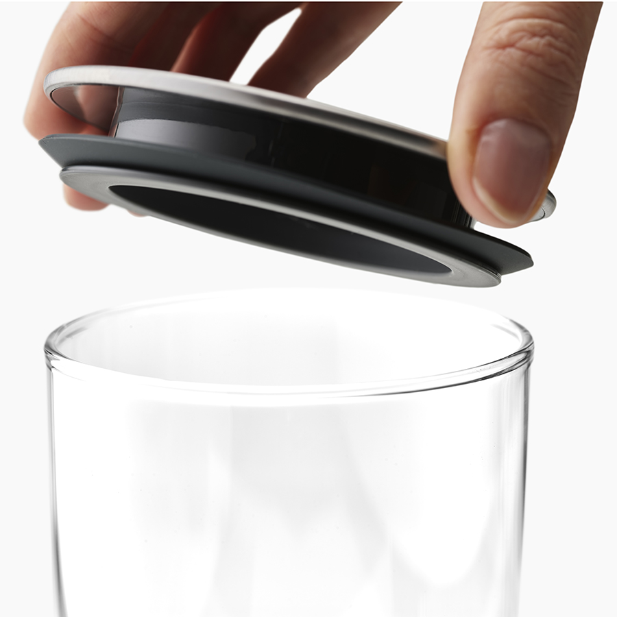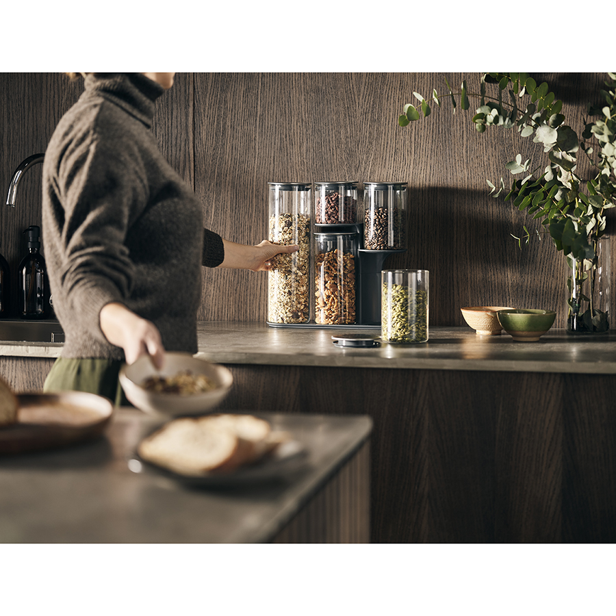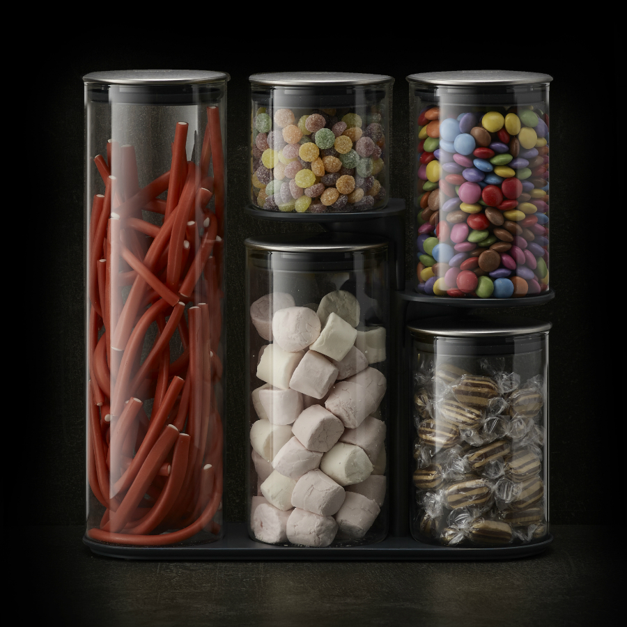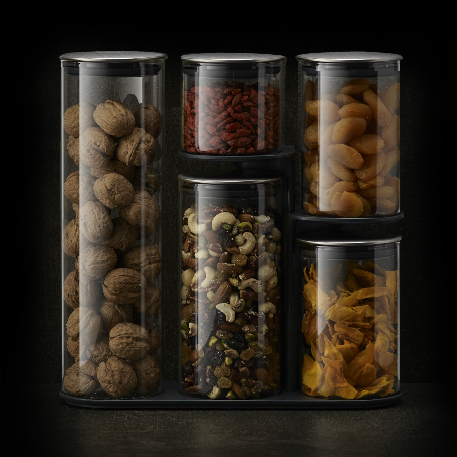 Эргономичная подставка позволяет сэкономить пространство на кухонной поверхности и обеспечивает легкий доступ к любой банке.