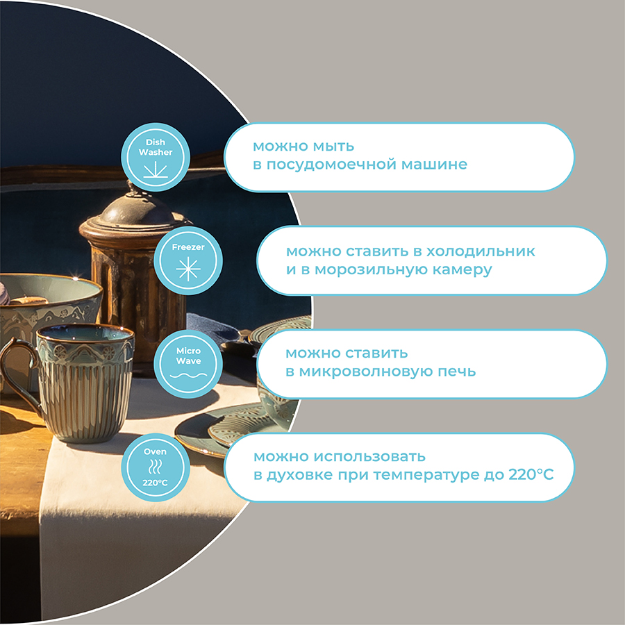 Посуду рекомендуется очищать от загрязнений в теплой воде с помощью мягкой губки с жидким средством. Допускается мытье в посудомоечной машине, использование в морозильной камере, микроволновой печи и духовке при температуре не выше 180 °C.