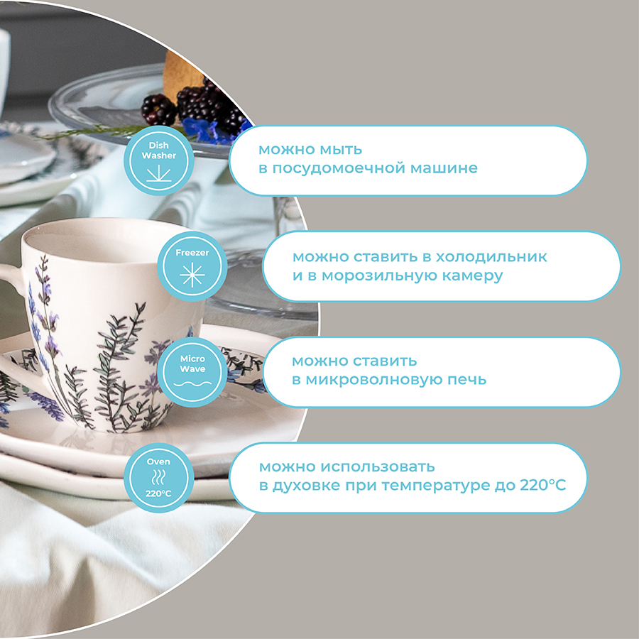 Можно мыть в посудомоечной машине, ставить в микроволновую печь, морозильную камеру, а также использовать в духовке при температуре не выше 180 °C.
